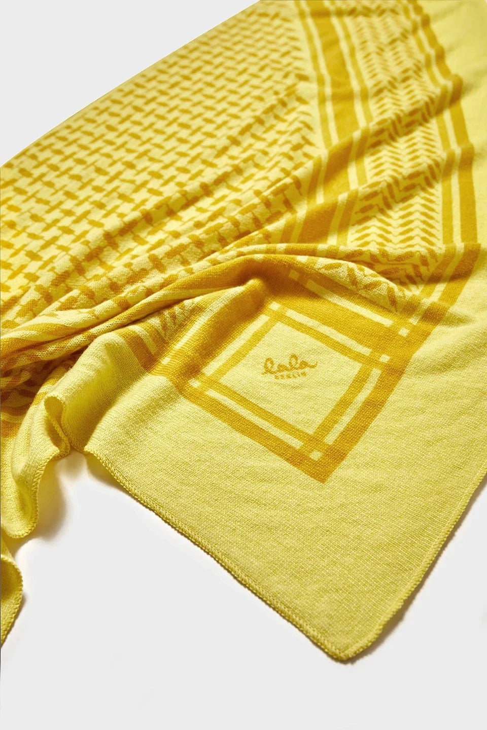 Driehoekige sjaal van Lala Berlin, gemaakt van kasjmier in een lichtgele tint. De sjaal heeft een geometrisch patroon met de merknaam die op de stof is gedrukt.