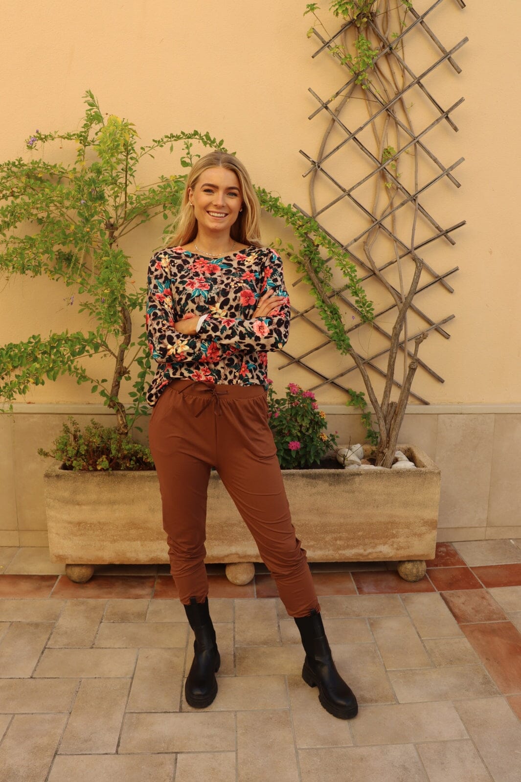 Bruine broek van Liberte, gemaakt van zachte polyester en elastaan. De broek is uitgevoerd in superzachte Alma-kwaliteit en is geschikt om thuis in te ontspannen en voor dagelijks gebruik.