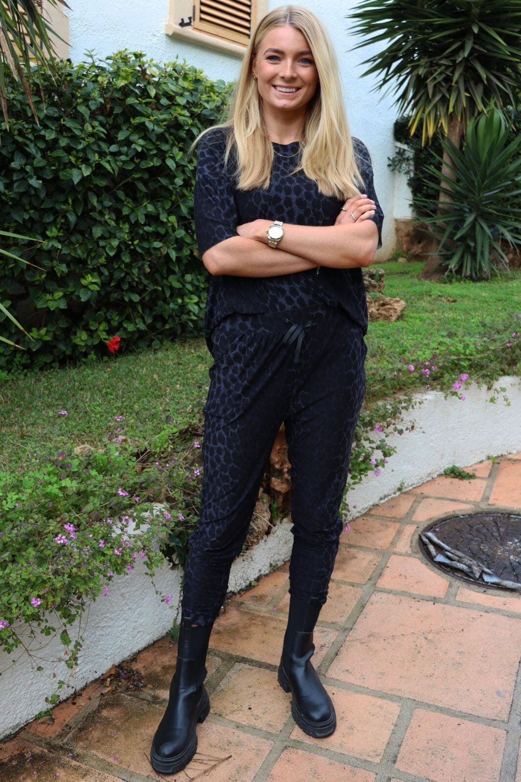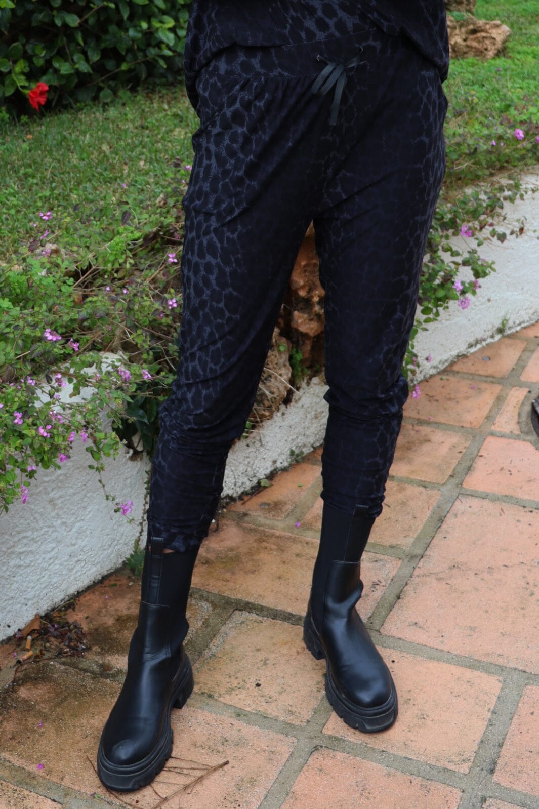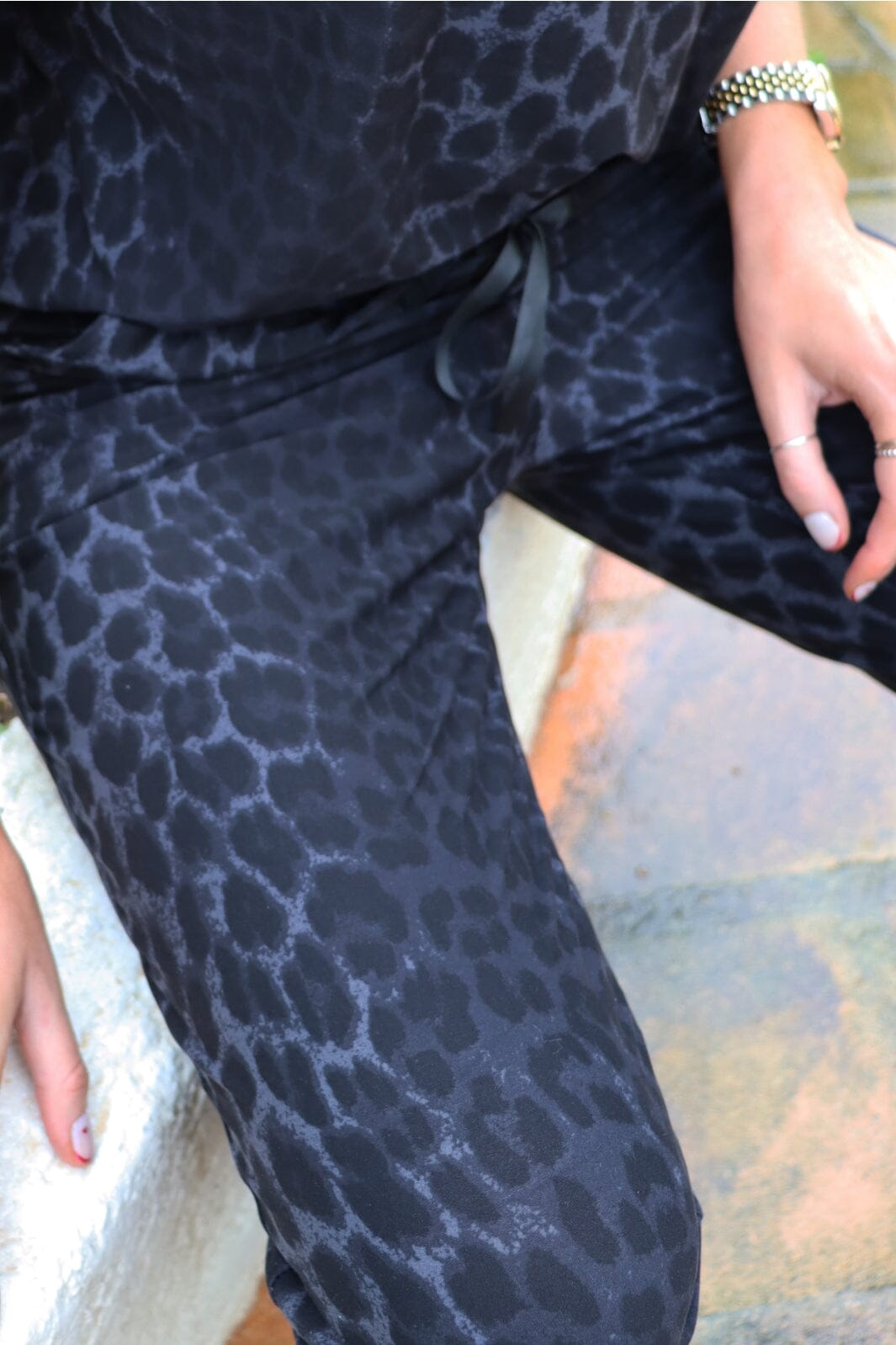 Broeken van Liberte in Alma-kwaliteit met donkergrijs luipaardprint. De broeken hebben een losse pasvorm en enkel lengte met elastische taille en koorddetail.
