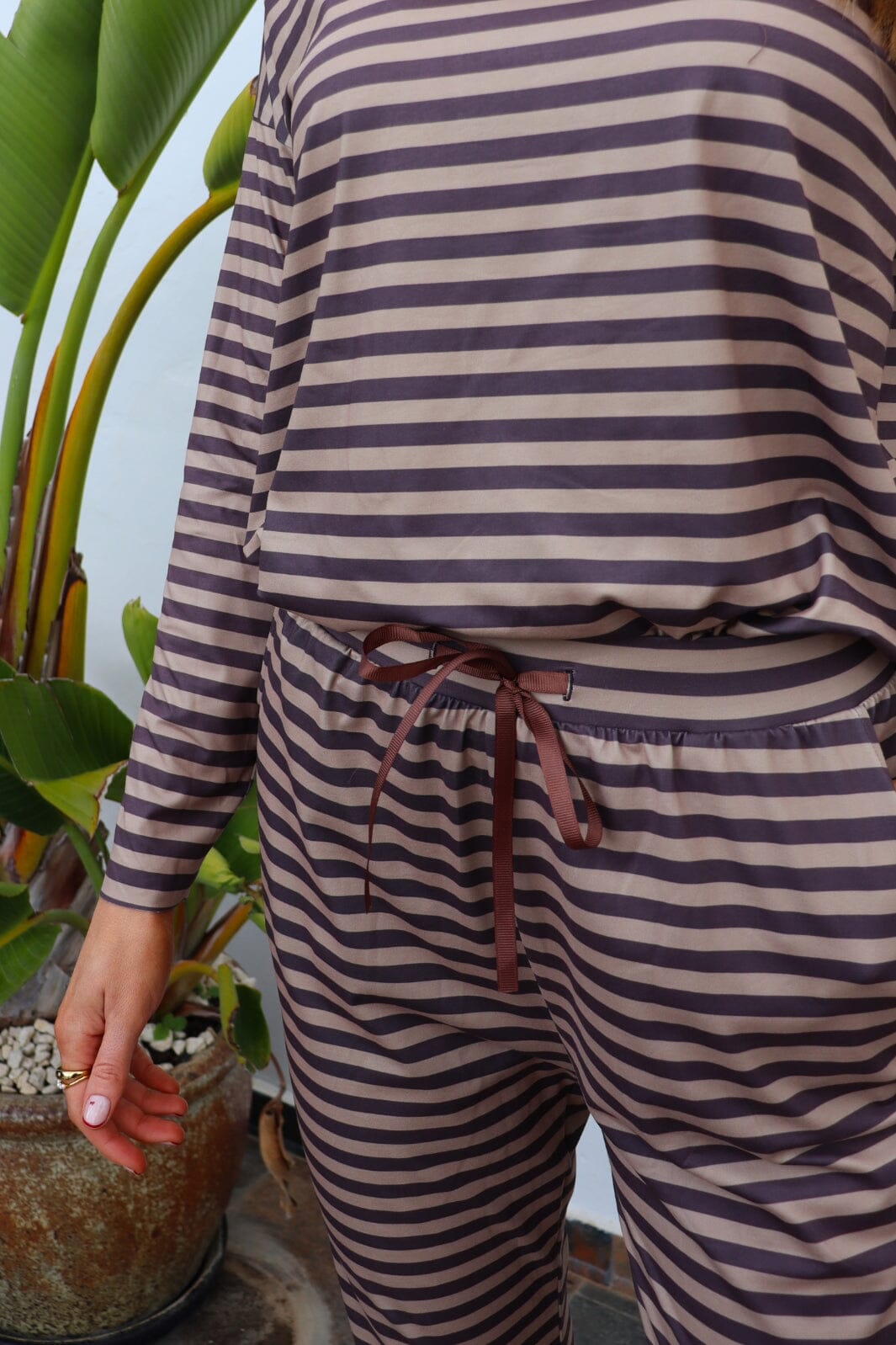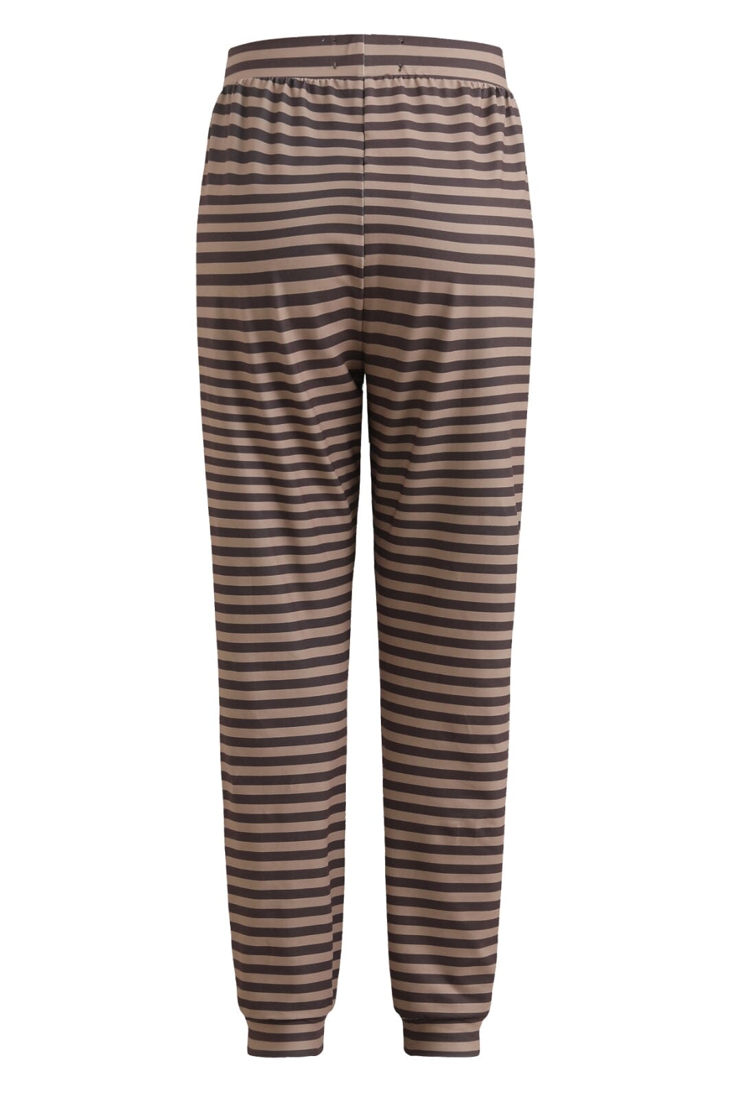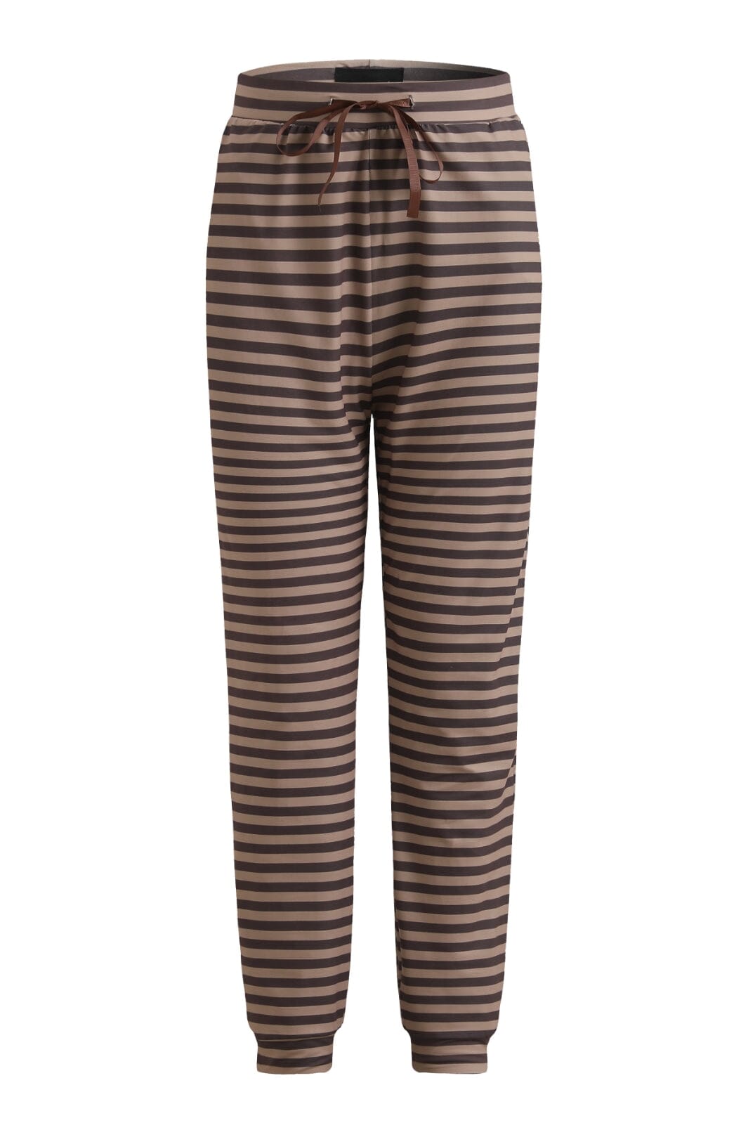 Gestreepte broeken van Liberte in bruin en beige tinten. De broeken hebben een enkel lengte en zijn ontworpen met elastiek en een koord in de taille. Ze zijn gemaakt van een licht en rekbaar materiaal.