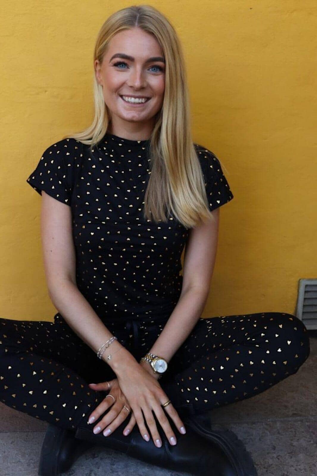 Zwart T-shirt van Liberte met kleine gouden hartjes verspreid over de hele stof. Het heeft korte mouwen en een ronde halslijn.