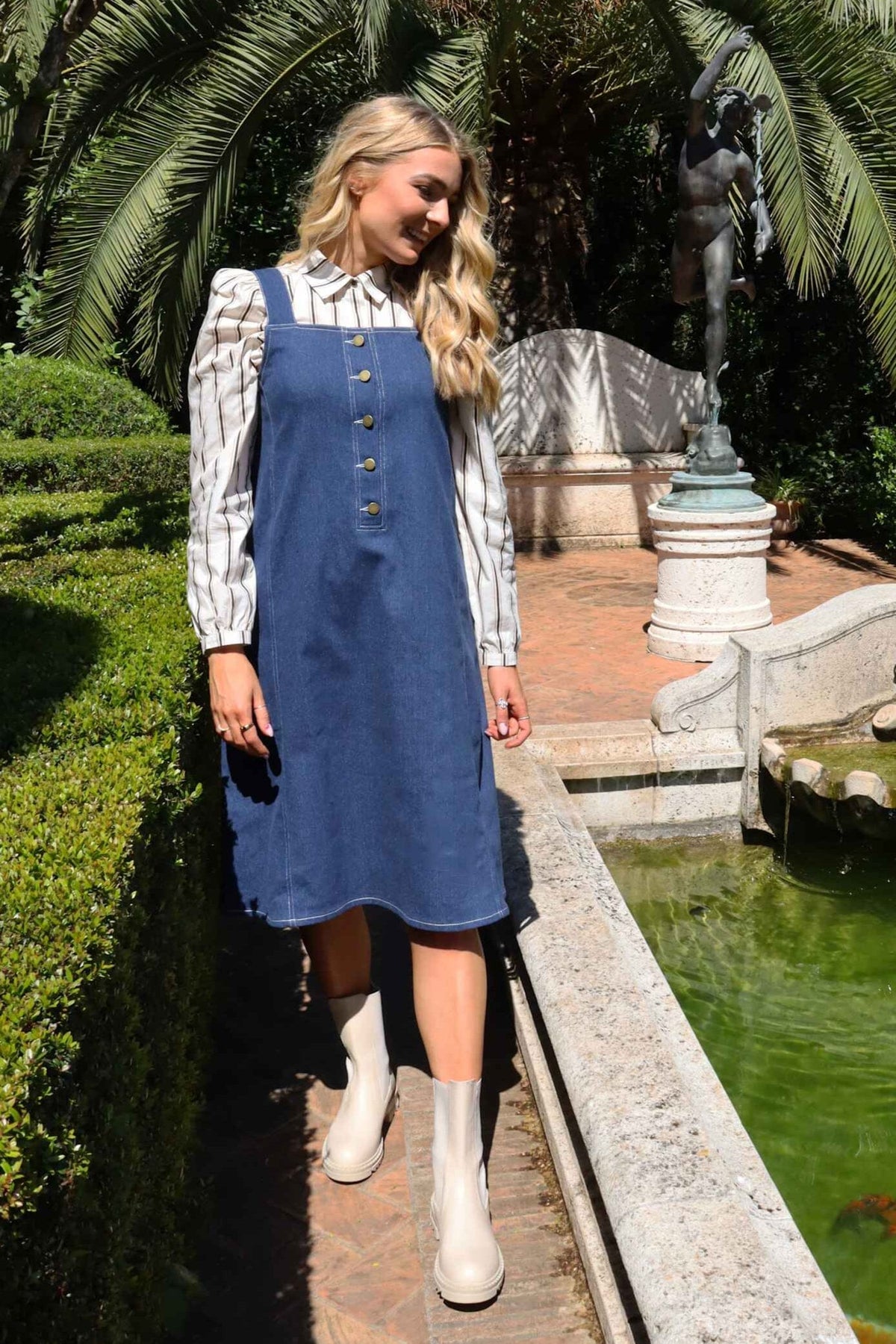 Denim-overall van Liberte in klassiek blauw. Hij heeft brede bandjes en een knoopsluiting aan de voorkant met decoratieve stiksels langs de randen.