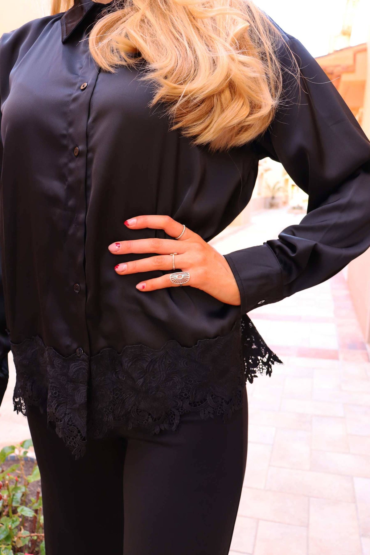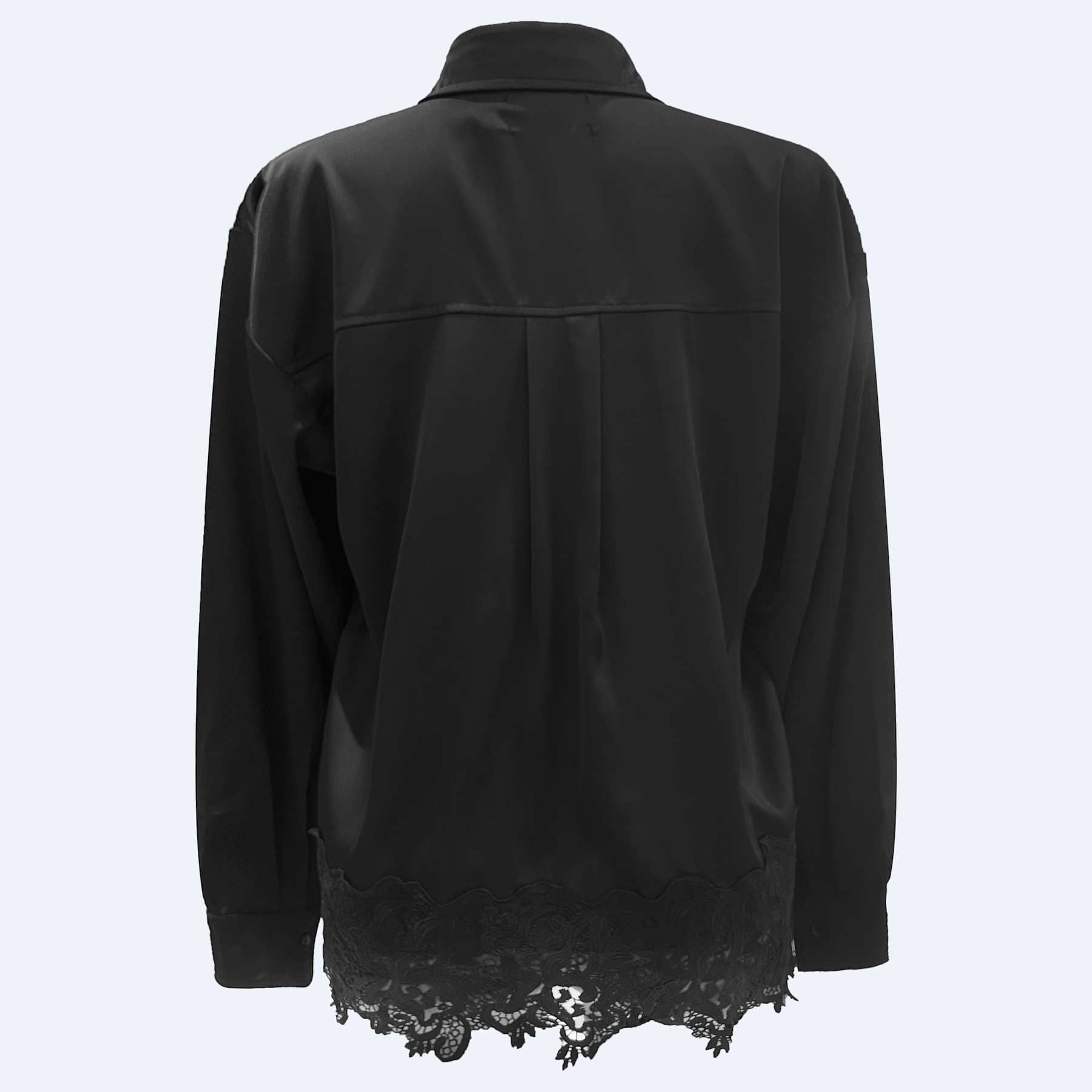 Zwart shirt van Liberte met lange mouwen, knoopsluiting aan de voorkant en kanten rand aan de onderzijde. Het shirt heeft een losse pasvorm en een overhemdkraag.