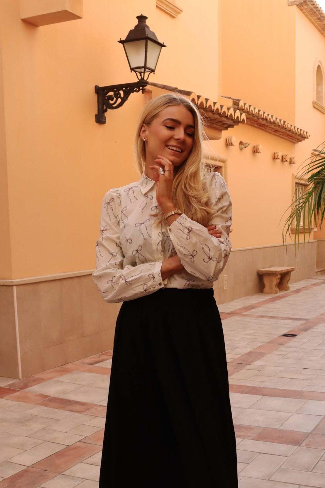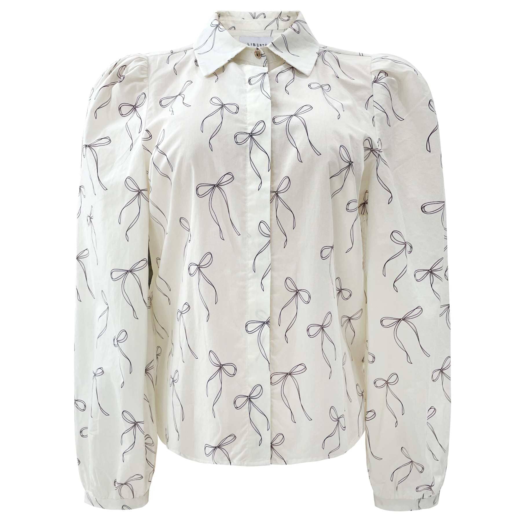 Crèmekleurige blouse van Liberte met een patroon van zwarte strikken. De blouse heeft lange mouwen en een klassieke overhemdkraag.