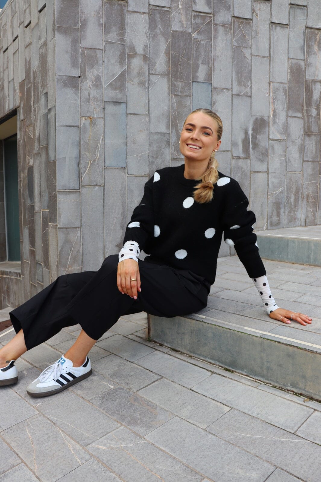 Zwarte pullover van Liberte met witte stippen. De pullover heeft een ronde hals, lange mouwen en een losse pasvorm.