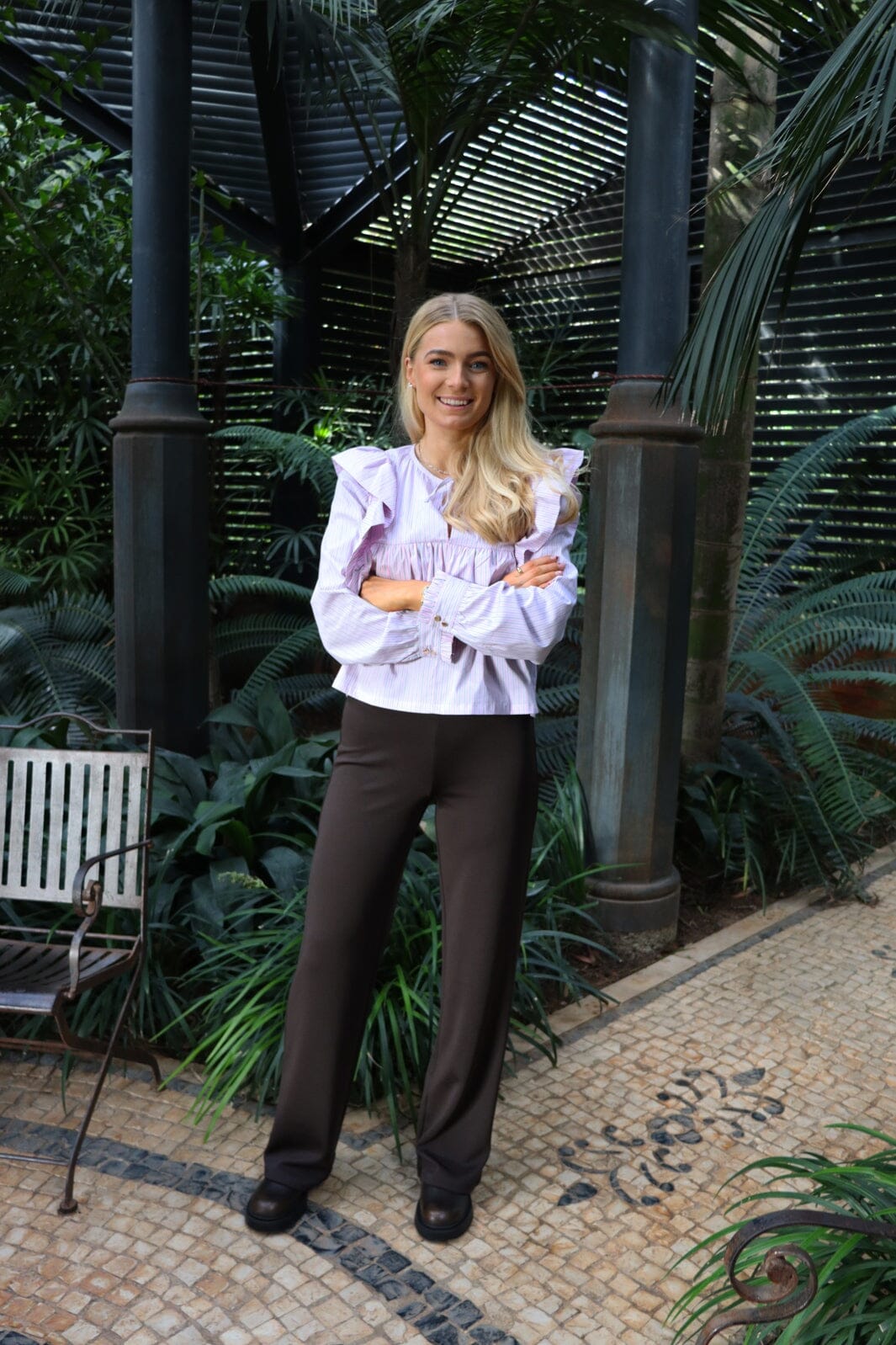 Roze gestreepte blouse van Liberte, gemaakt van 100 % katoen. De blouse heeft een roze en wit gestreept patroon met plooien op de schouders.