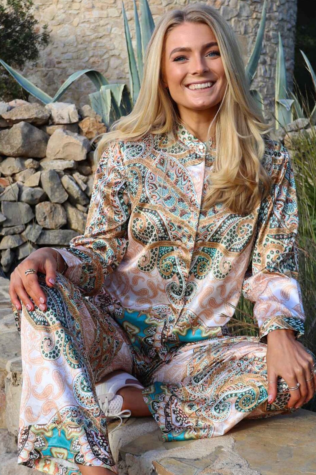Shirt van Liberte met een paisleymotief in crème en turquoise tinten. Het shirt heeft een klassieke kraag en lange mouwen met knopen bij de manchetten.