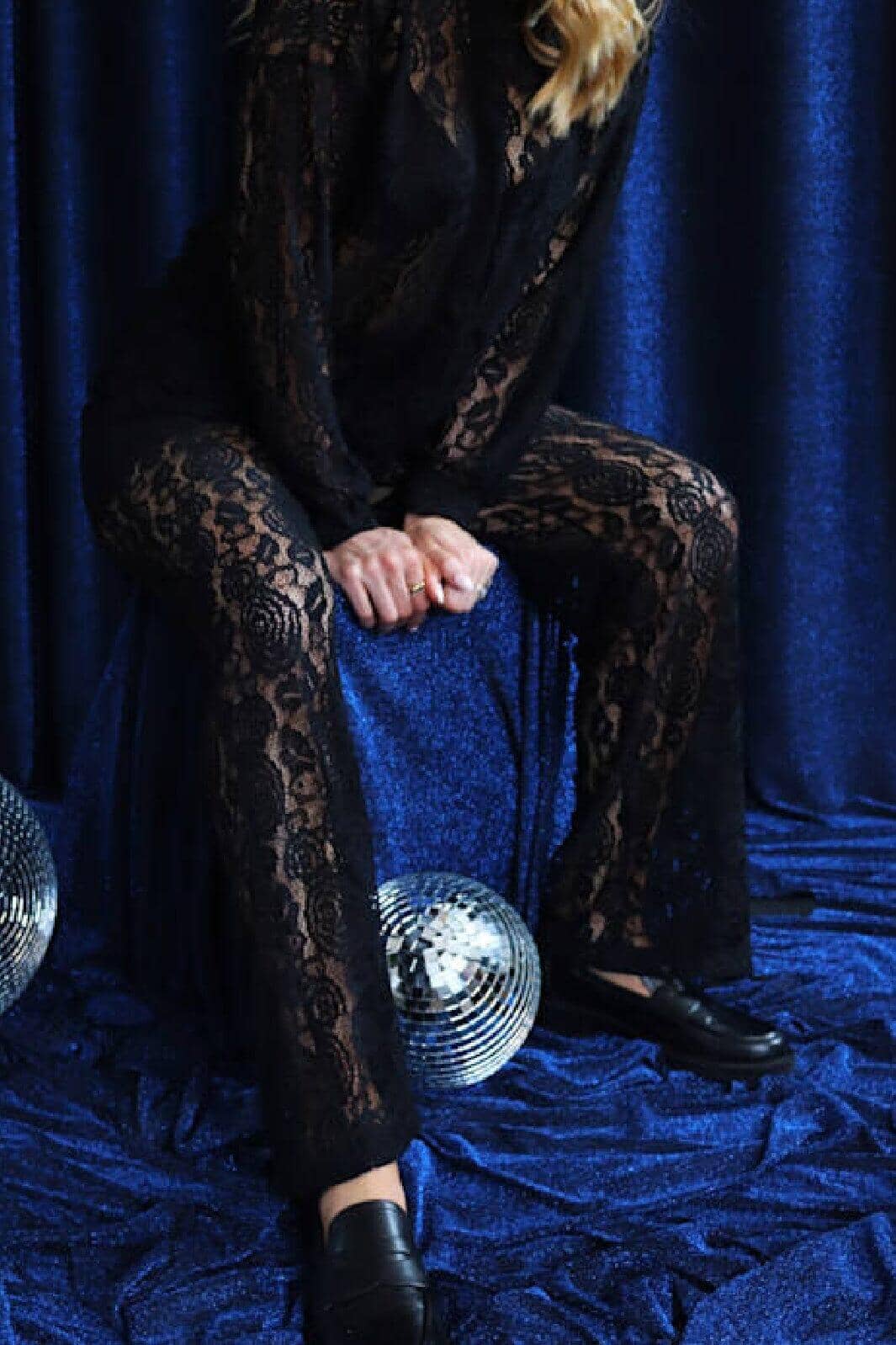 Zwarte kanten broek van Liberte met een bloemmotief. De broek heeft transparante pijpen en een meer ondoorzichtig bovendeel en is geschikt voor feestelijke en formele gelegenheden.