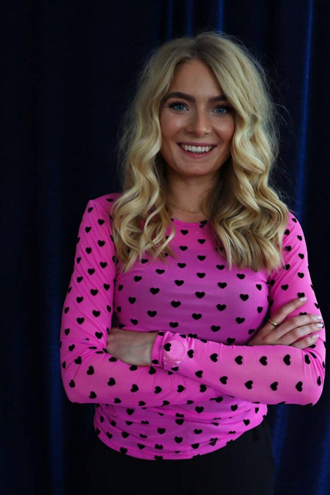 Roze mesh T-shirt met lange mouwen van Liberte met zwarte harten over het hele oppervlak. Het T-shirt heeft een slim fit-pasvorm en een ronde hals.