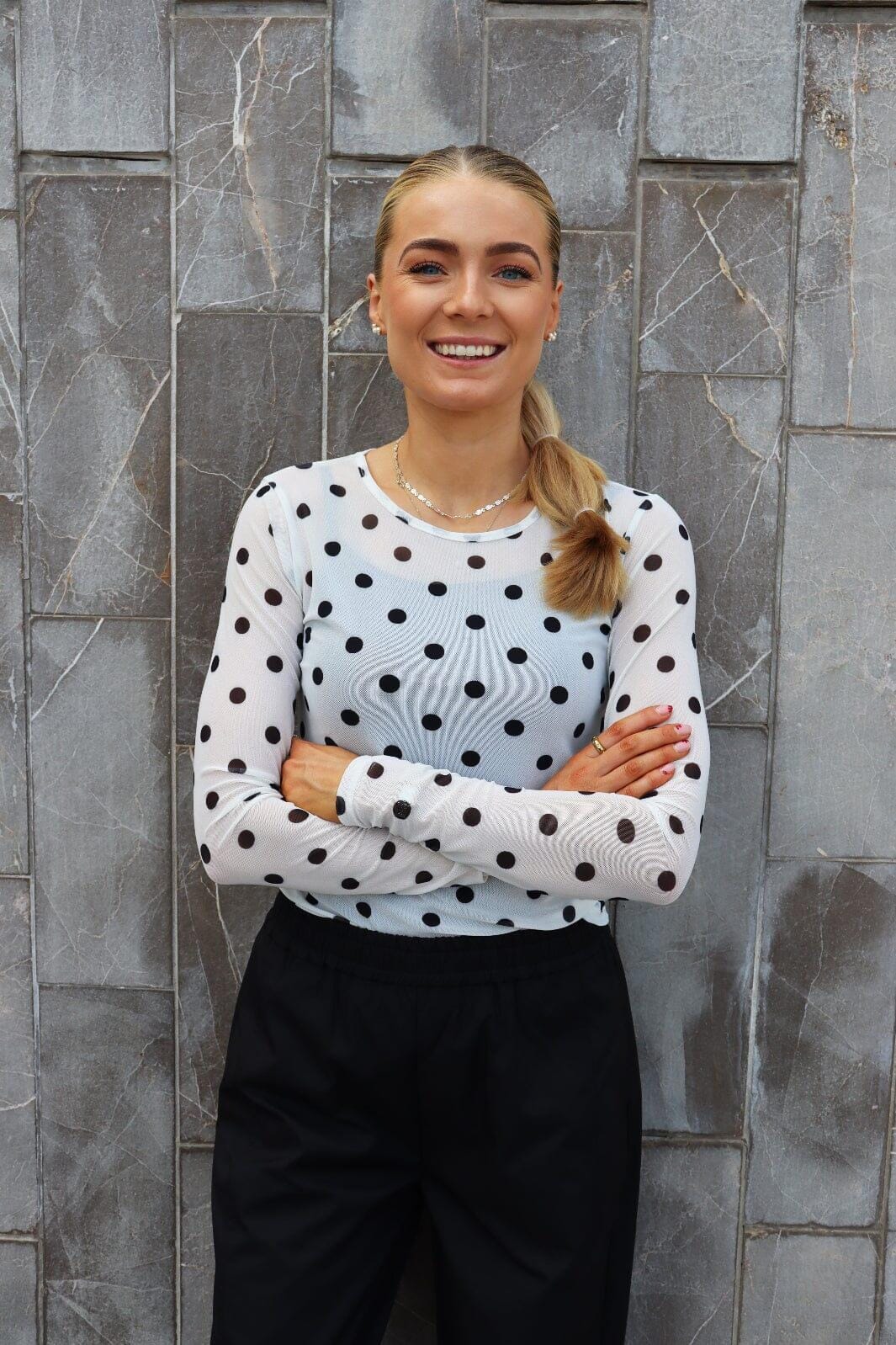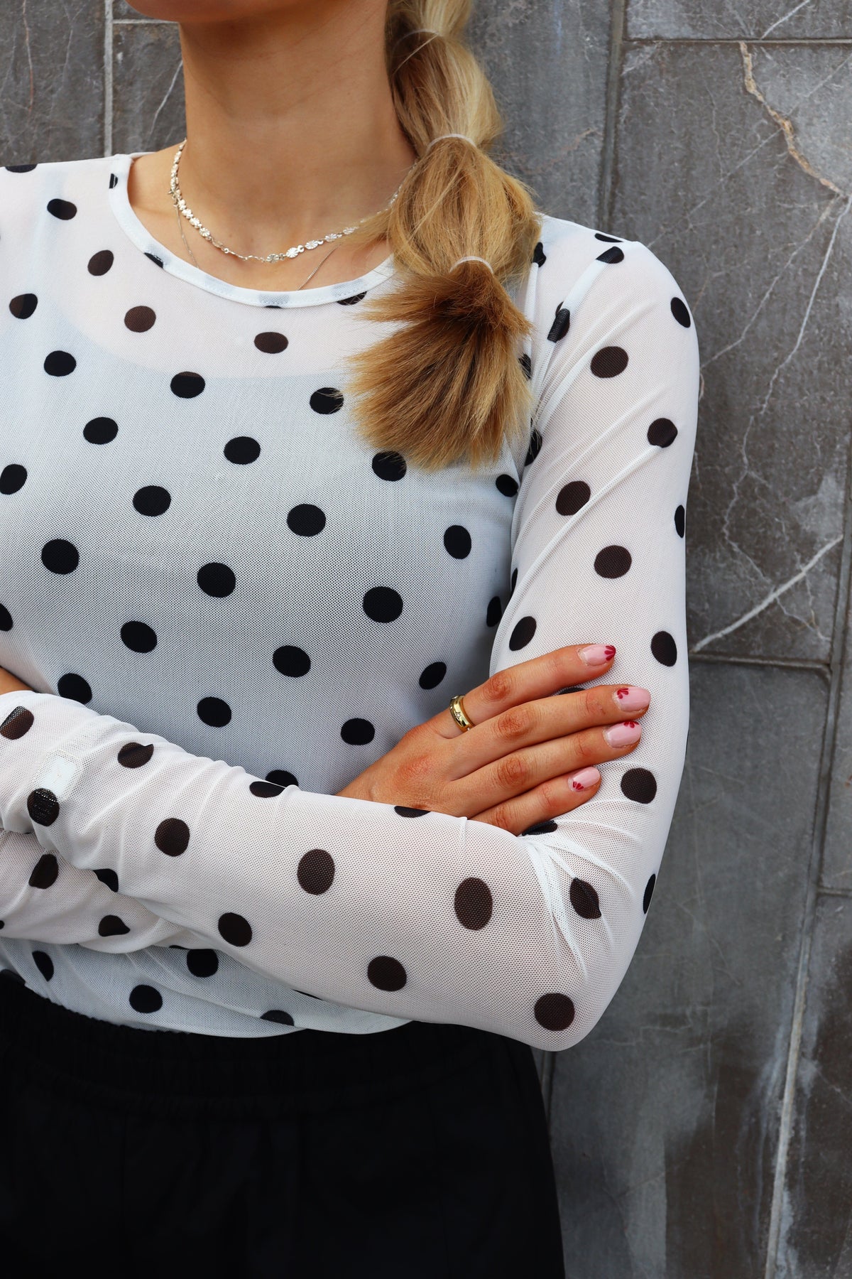 Een mesh T-shirt van Liberte met lange mouwen. De witte basis heeft grote zwarte stippen in een polkadotpatroon.