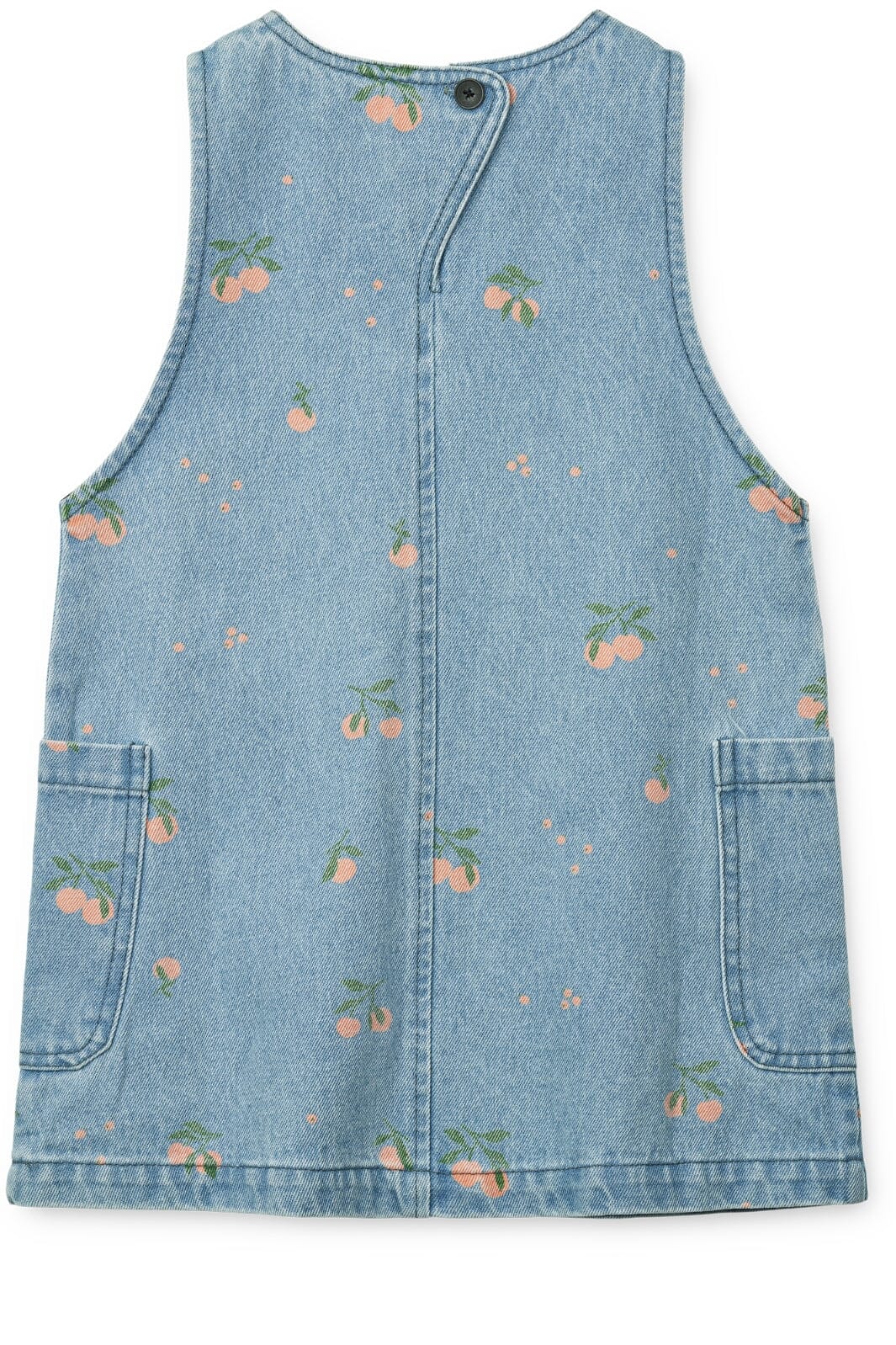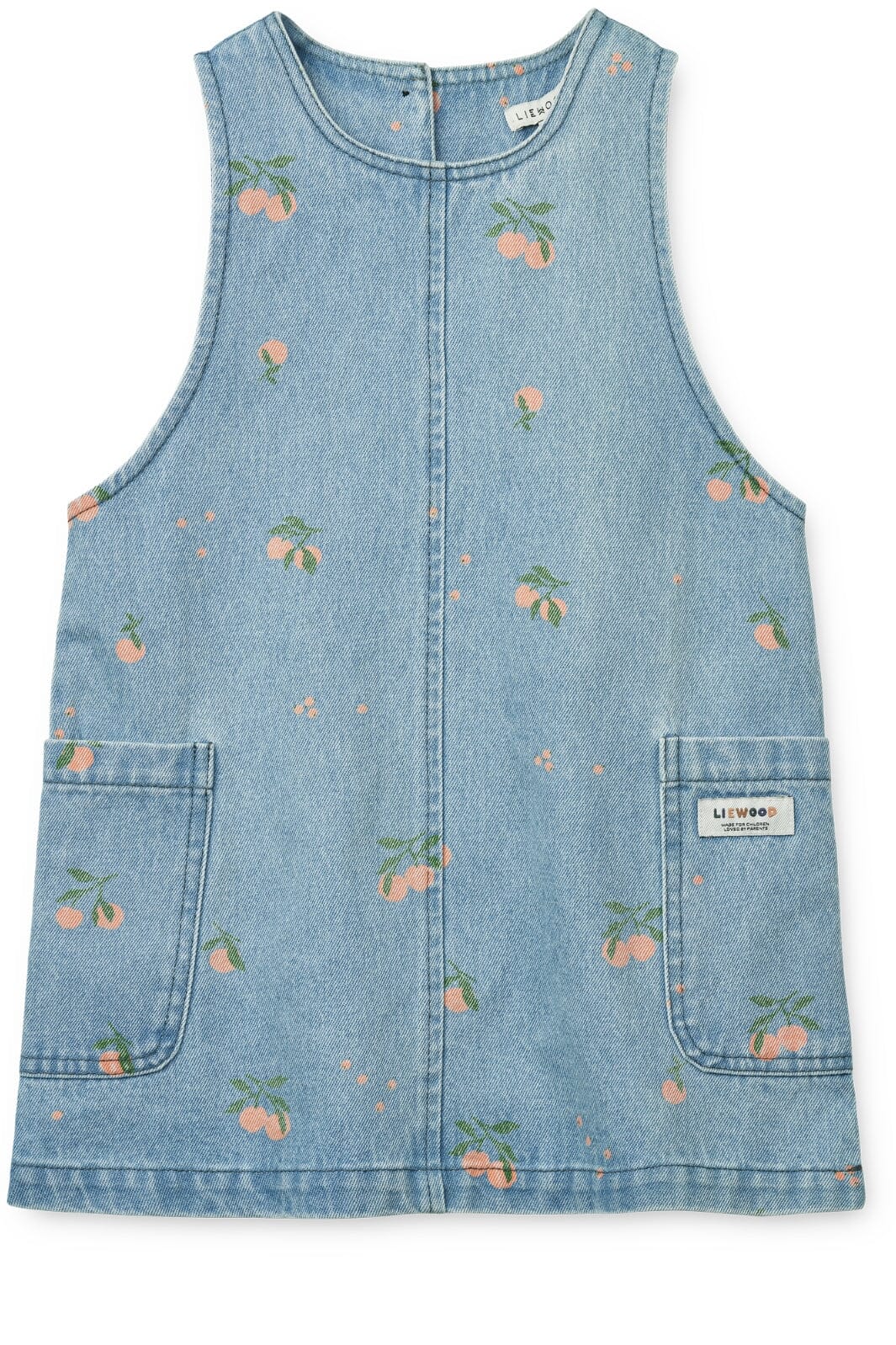 Denimjurk van Liewood in lichtblau denim met een schattig fruitprint. De jurk heeft een patroon van perziken en groene bladeren, twee praktische zakken en knoopsluiting bij de hals.
