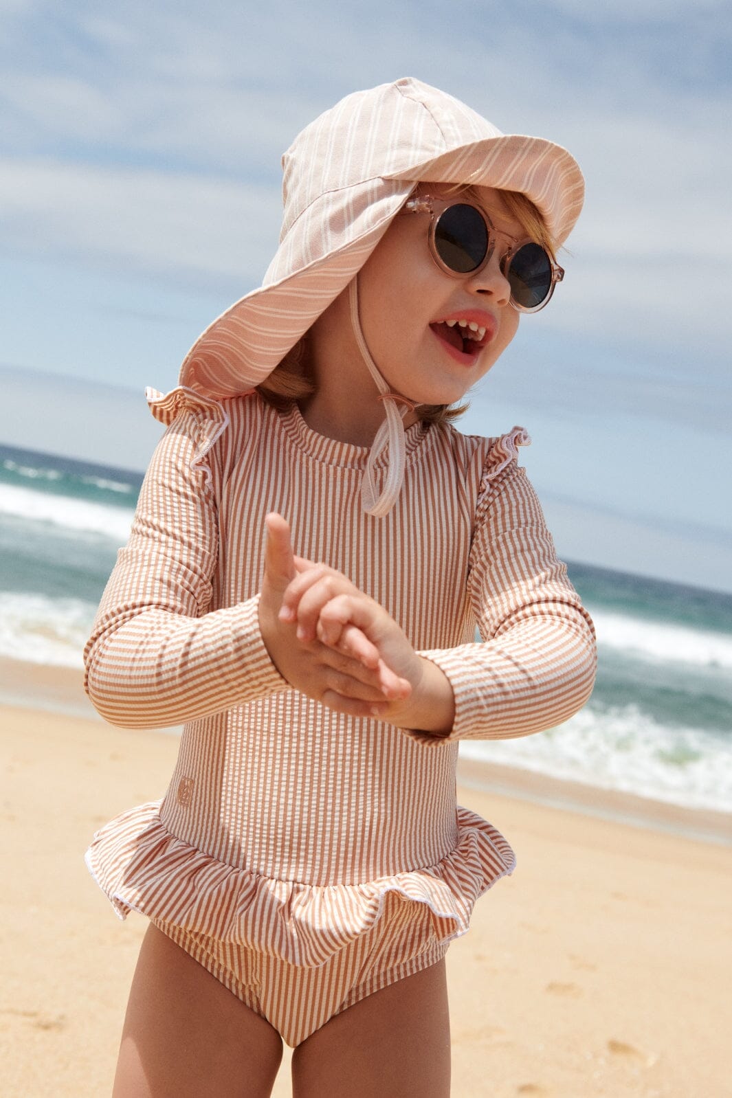 Gestreepte zonnehoed van Liewood in lichtroze en crème. Hij heeft een brede rand aan de voorkant en extra bescherming in de nek, die het gezicht, de oren en de nek tegen de zon beschermt.