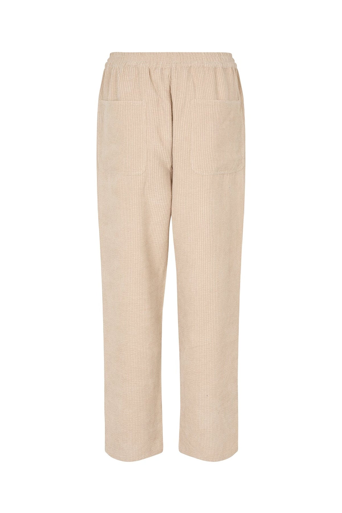 Broek van Lollys Laundry in zandkleurige stof met geribbelde textuur. De elastische taille en regular fit maken de broek comfortabel om te dragen, zowel thuis als in de stad.