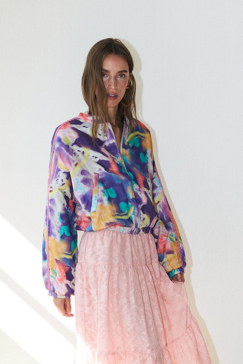 Jas van Lollys Laundry met een kleurrijk patroon in paarse, roze, gele en groene tinten. De jas heeft een oversized pasvorm en een hoge kraag.