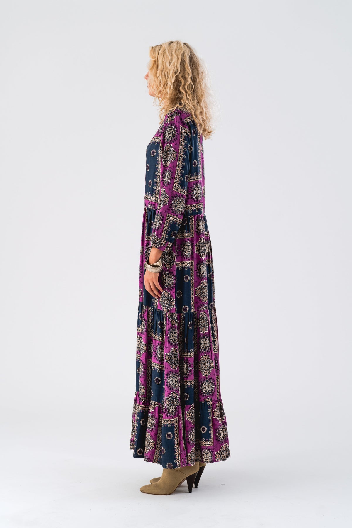Donkerblau maxikleed van Lollys Laundry met roze en crème patroon. Het kleed heeft een overhemdkraag, lange mouwen en knoopsluiting aan de voorkant. De gelaagde rok geeft het kleed karakter.