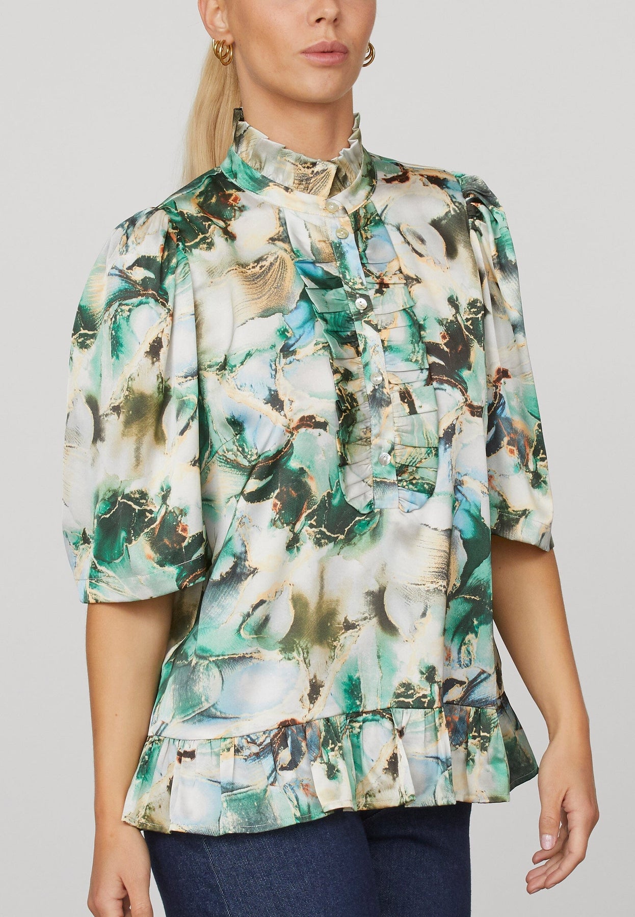 Korte blouse van Love & Divine met een gemarmerd patroon in groene en witte tinten. De blouse heeft een hoge hals met ruches, 3/4-mouwen en knopen aan de voorkant.