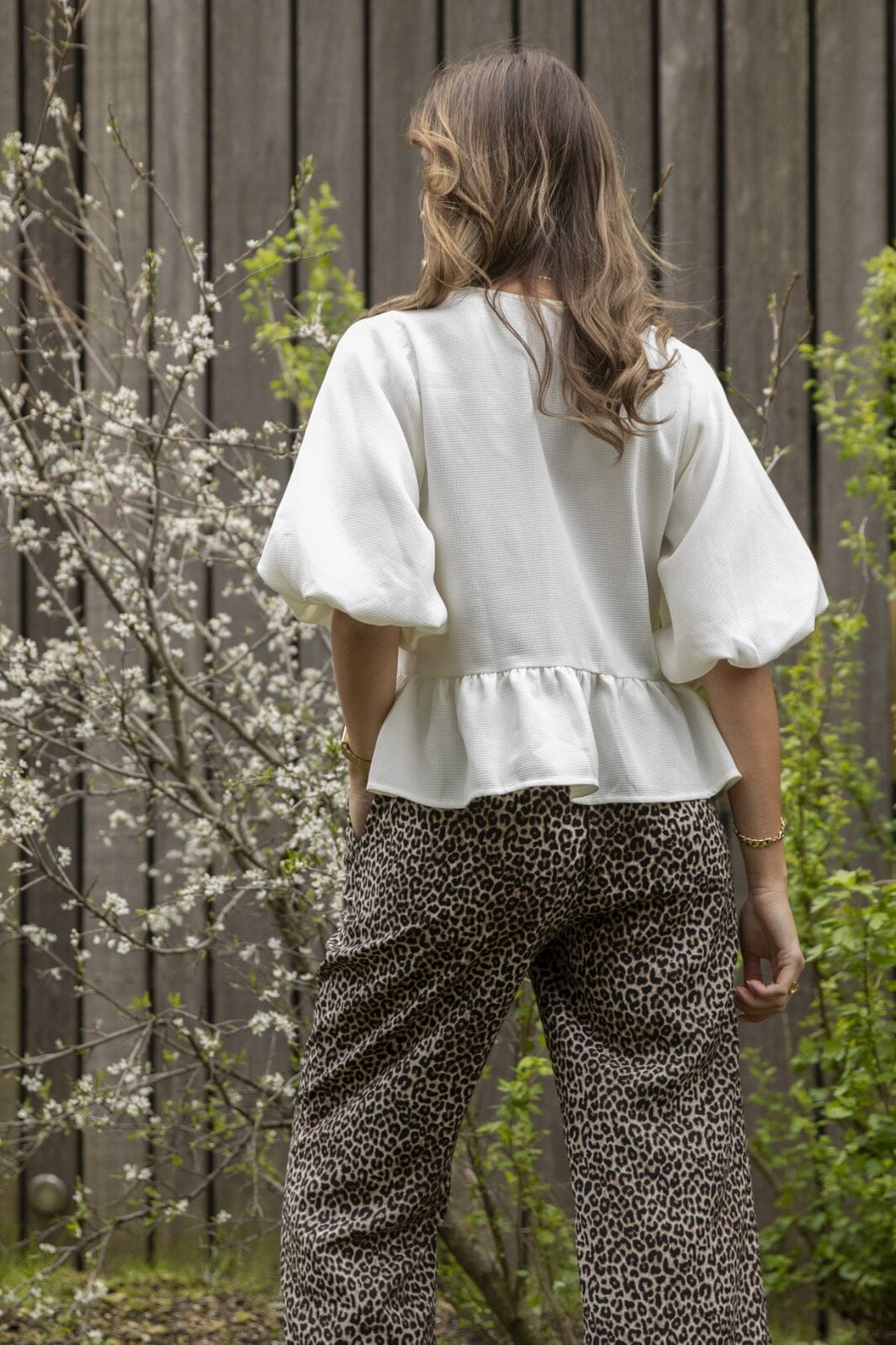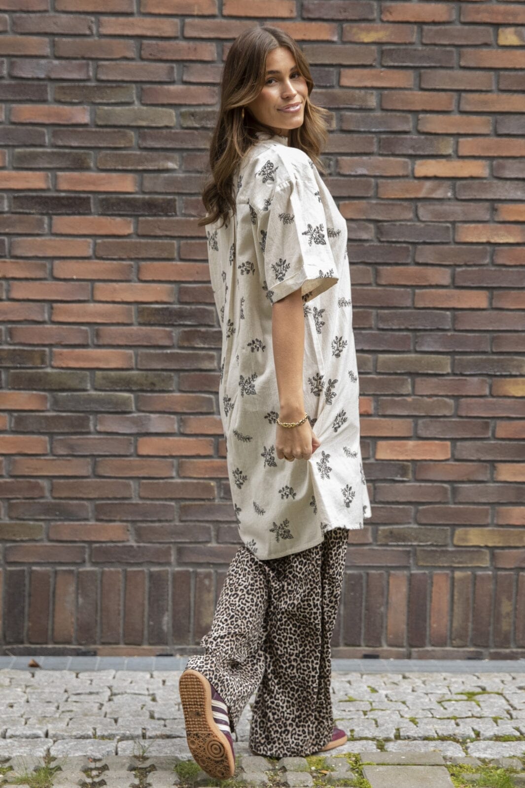 Broeken van Love & Divine in 100% polyester met een luipaardprint in bruine en beige tinten. De broeken hebben een losse pasvorm en een brede elastische tailleband.