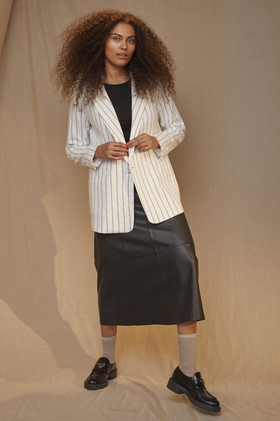 Zwarte leren rok van Love & Divine met A-lijn silhouet. De lange rok heeft panelen met zichtbare naden en een rits aan de achterkant.
