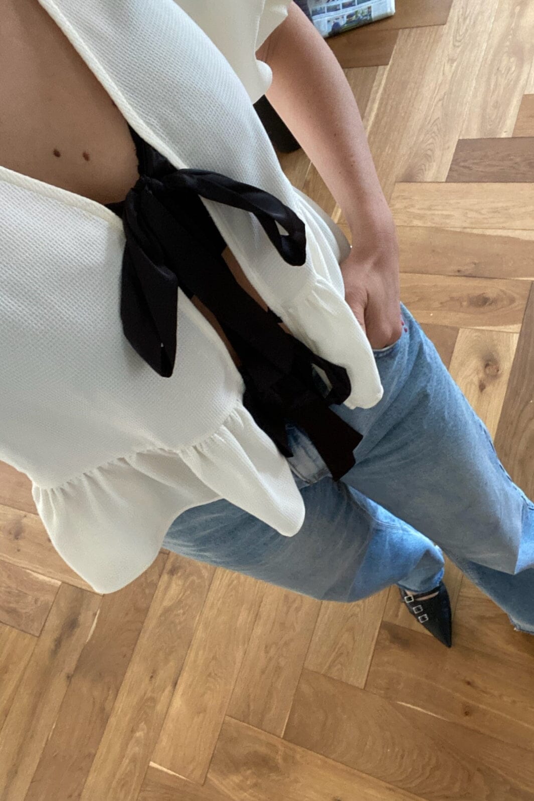 is een schattige loszittende blouse met korte pofmouwen. Het heeft 2 strikbanden in het midden en een peplum aan de onderkant. Het model is 182 cm lang en draagt maat S.