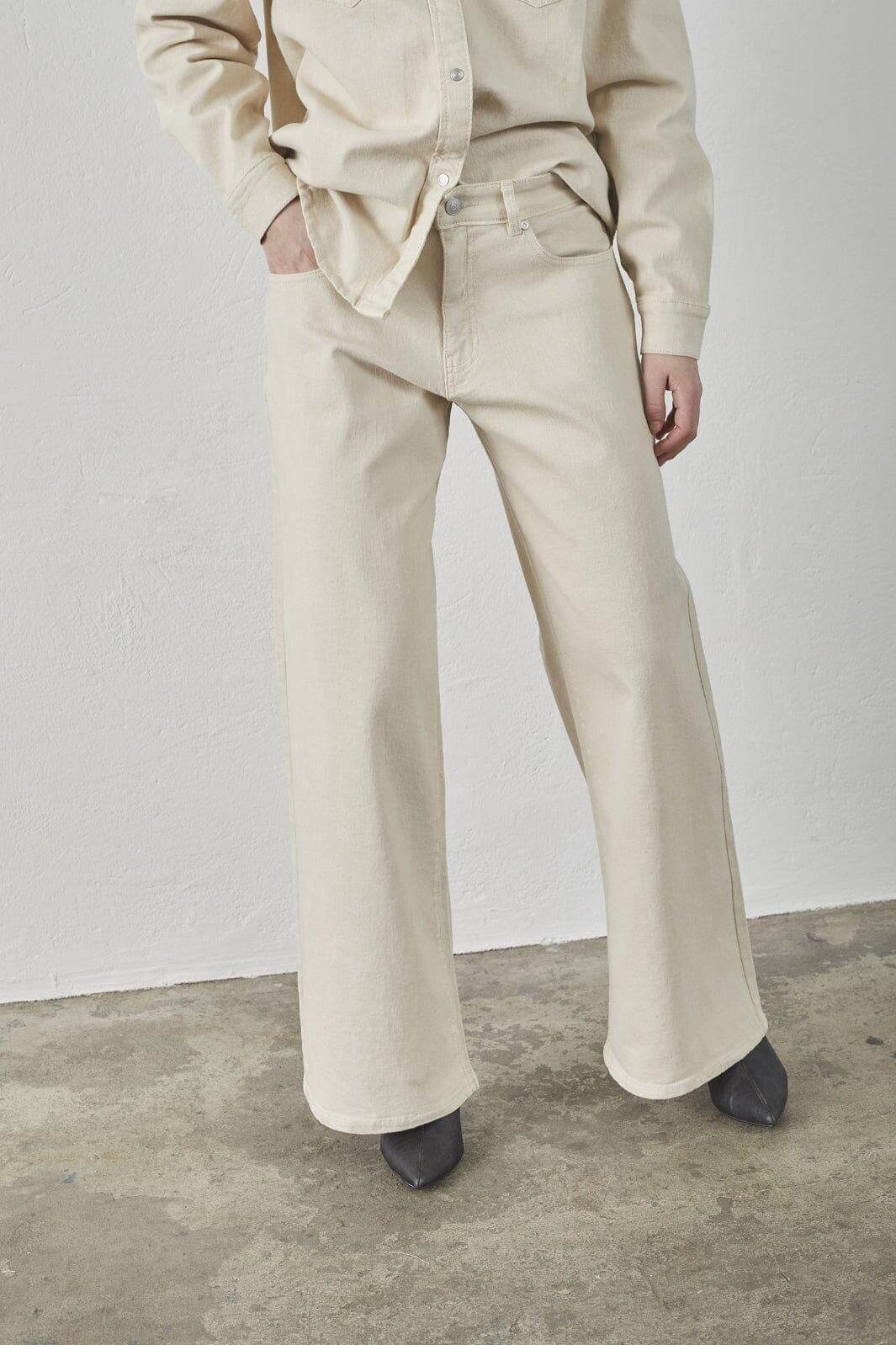 Broeken in licht beige van Love & Divine met een breed beenontwerp. De lichte porselein kleur maakt de broeken het hele jaar door gemakkelijk te combineren met andere kleuren.