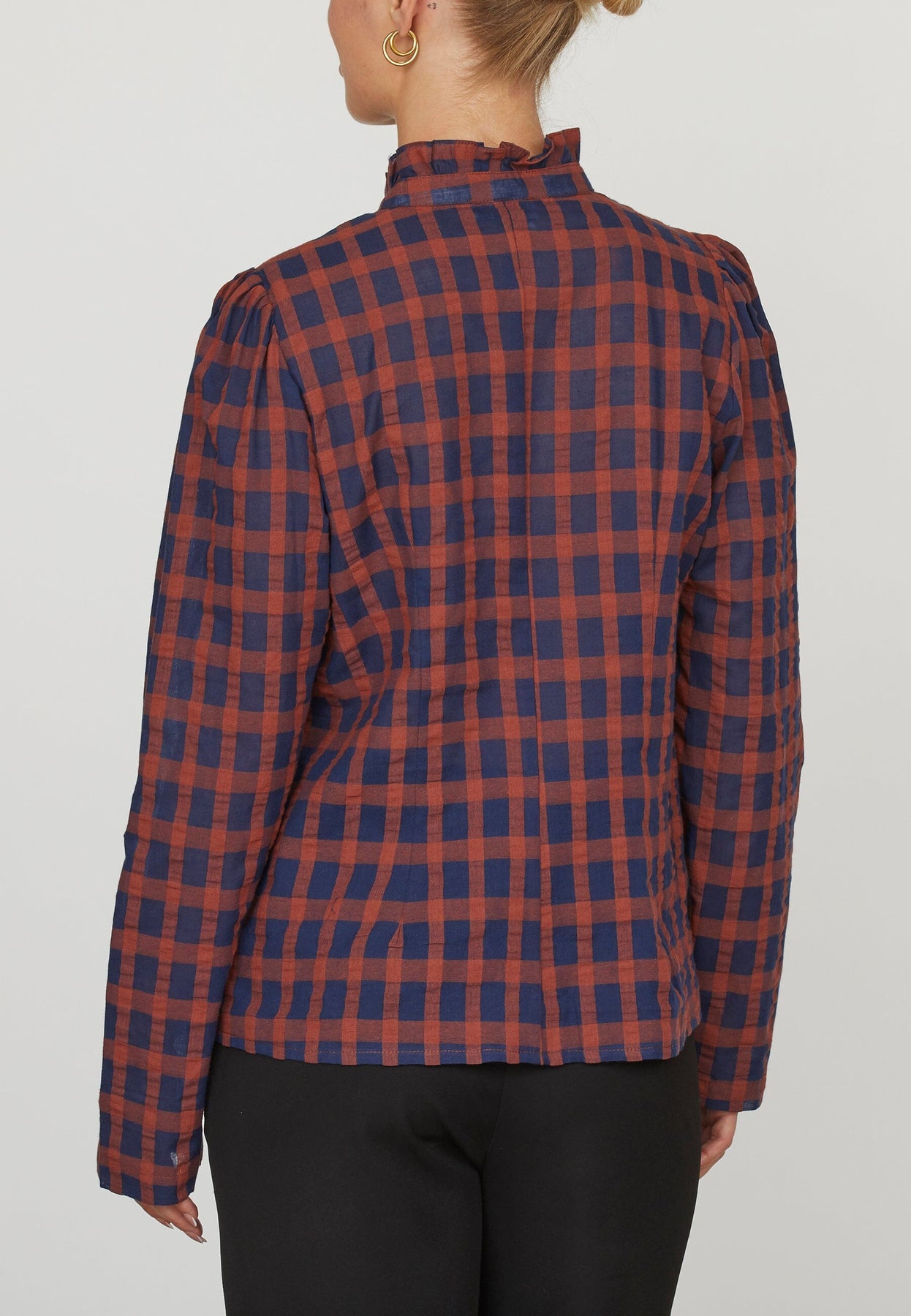 Geruite blouse van Love & Divine in donkerblauwe en bordeauxrode tinten. De blouse heeft pofmouwen en een hoge hals met ruchesdetails en een knoopsluiting aan de voorkant.