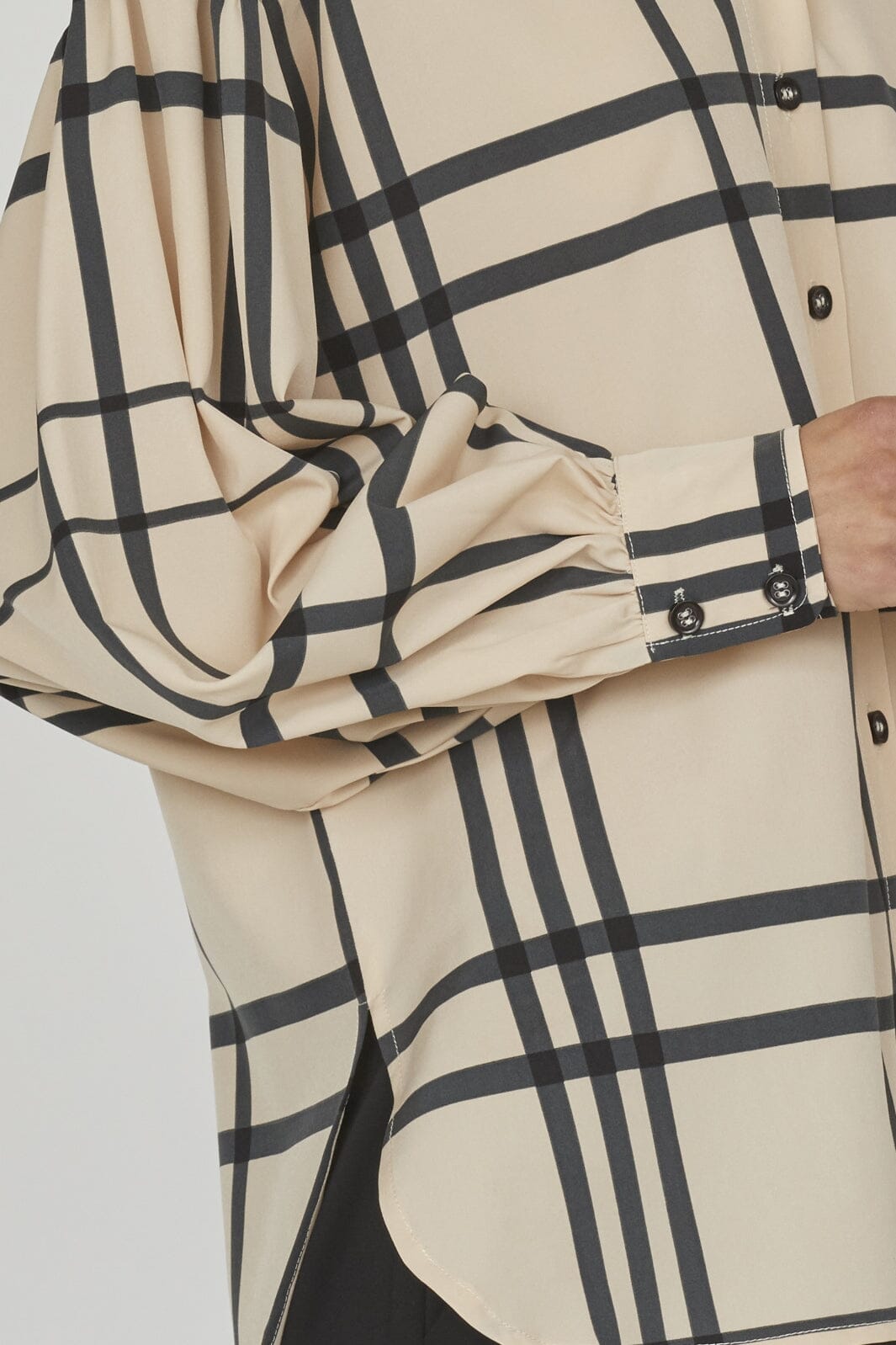 Geruite blouse van Love & Divine in beige en zwart. Het heeft lange mouwen met een lichte puffeffect en een klassieke kraag. De knopen aan de voorkant maken het gemakkelijk om aan en uit te trekken.