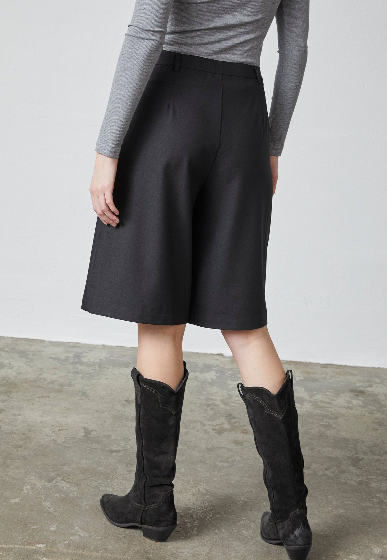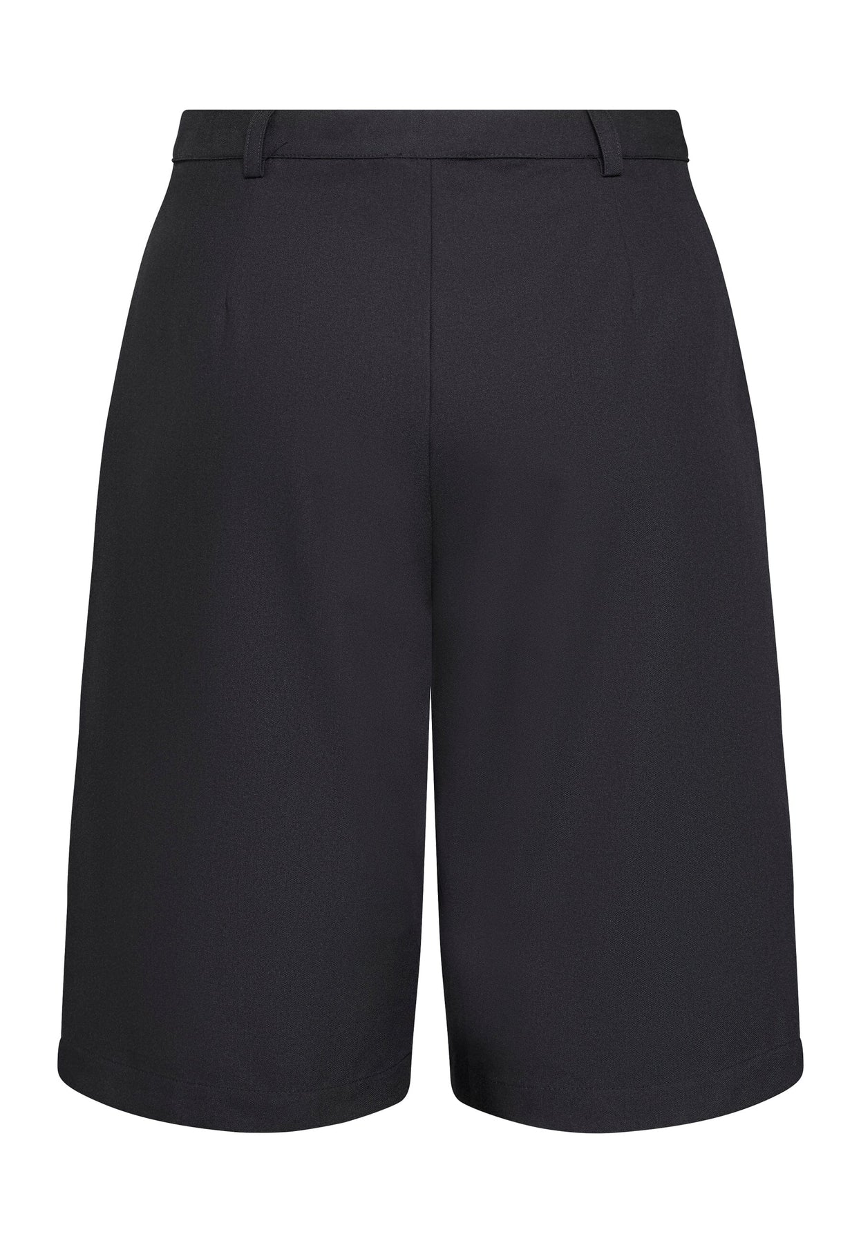 Zwarte shorts van Love & Divine met hoge taille en riemlussen. De losse benen reiken tot aan de knieën en hebben plooien aan de voorkant en zakken aan de zijkanten.