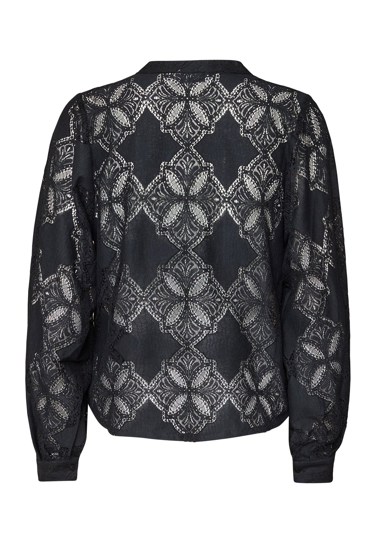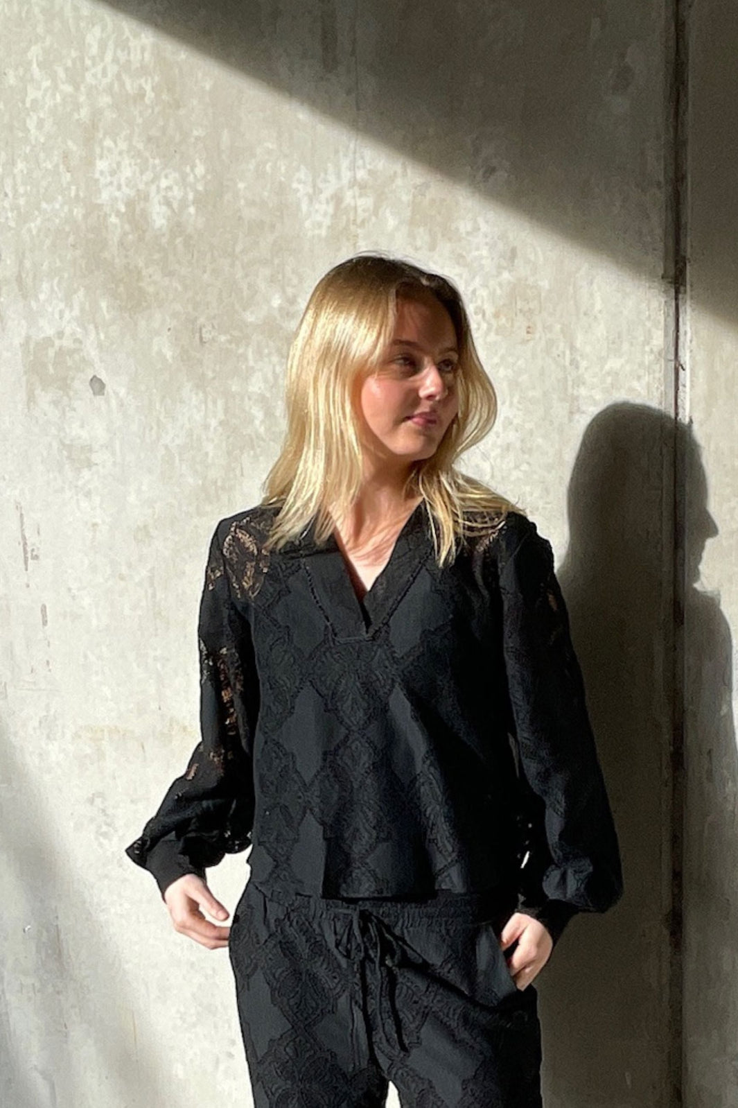 Zwarte blouse van Love & Divine met een doorlopend kantpatroon. De blouse heeft een diepe V-hals en lange, licht gepofte mouwen met manchetten.