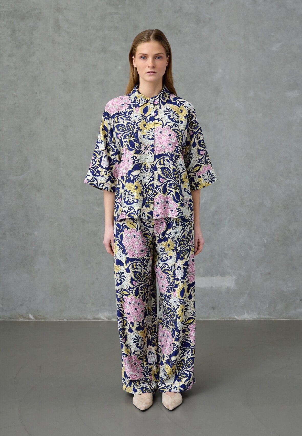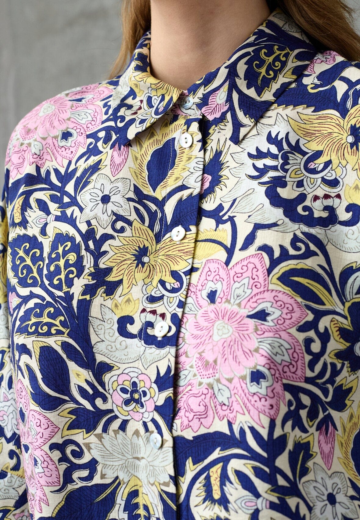 Blouse van Love & Divine in donkerblauwe en blauwe tinten met paisley- en bloemenprint. De blouse heeft een oversized pasvorm, driekwartmouwen en een klassieke kraag met knoopsluiting.