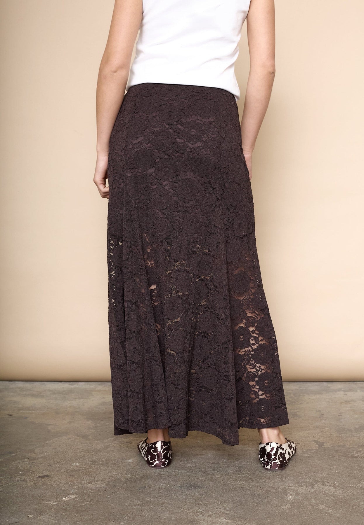 Bruine kantenrok van Love & Divine. De rok heeft een bloemenkantpatroon en komt tot halverwege de kuit. De stof is licht doorschijnend en heeft een A-lijn vorm.