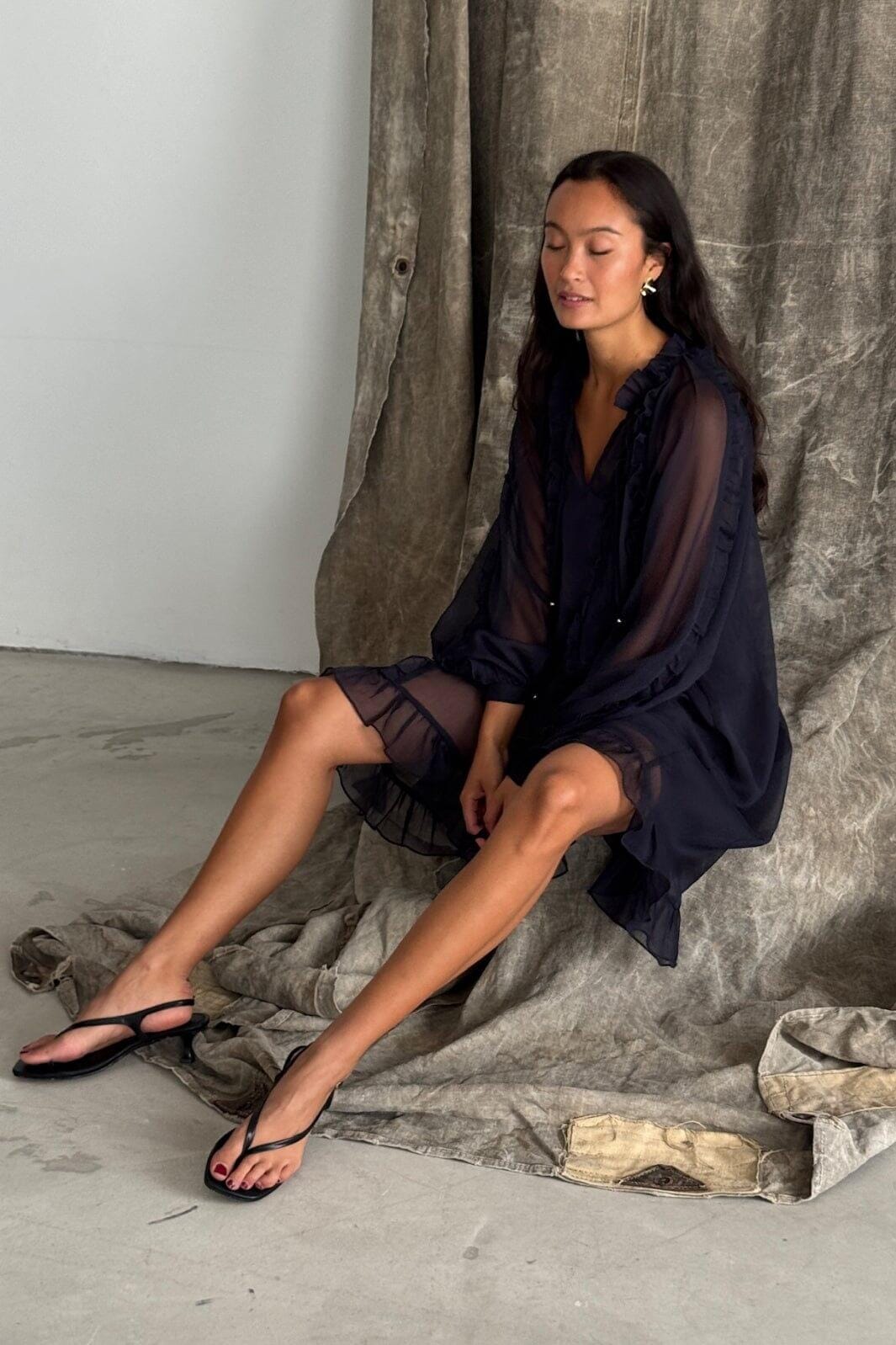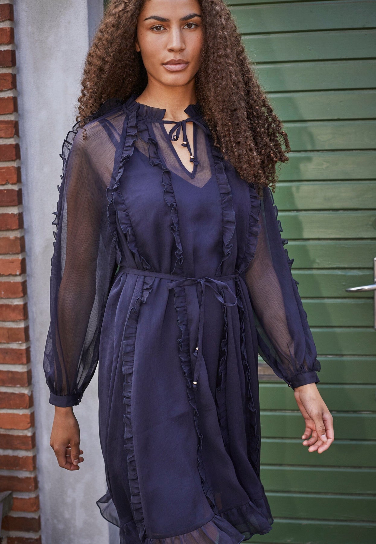 Navy jurk van Love & Divine met ruchesdetails. De jurk heeft een hoge hals met strikband, lange mouwen en een licht transparante stof met ruches langs de voorkant en de mouwen.