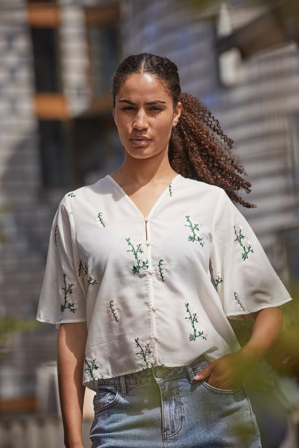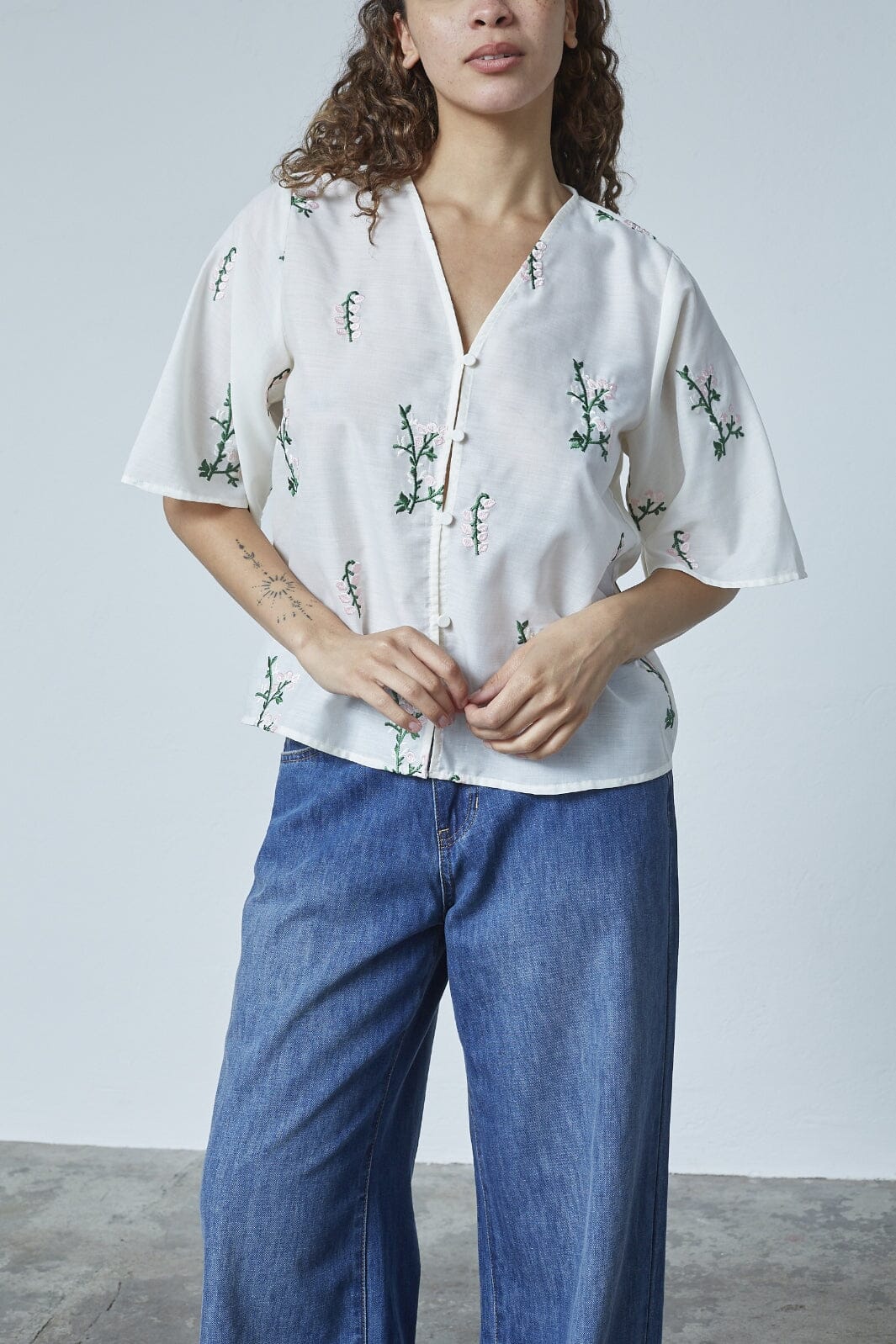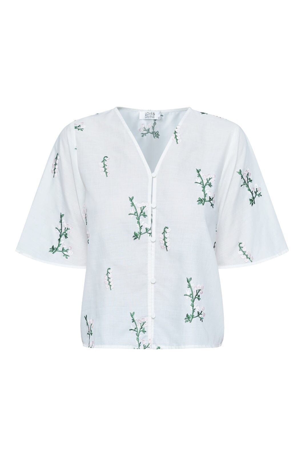 Crème-kleurige blouse van Love & Divine met geborduurde bloemen in roze en groene stelen. De blouse heeft een v-hals, knoopsluiting aan de voorkant en brede, korte mouwen.