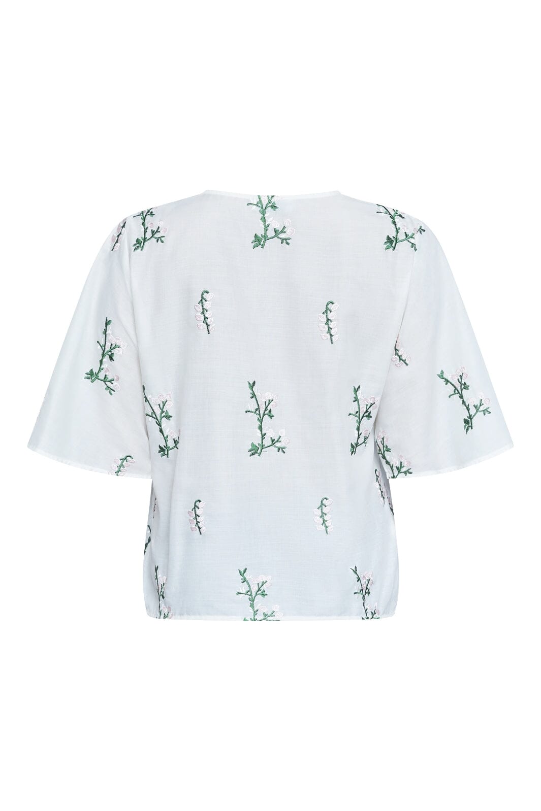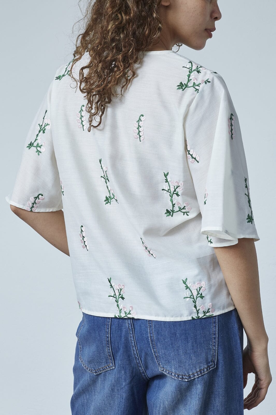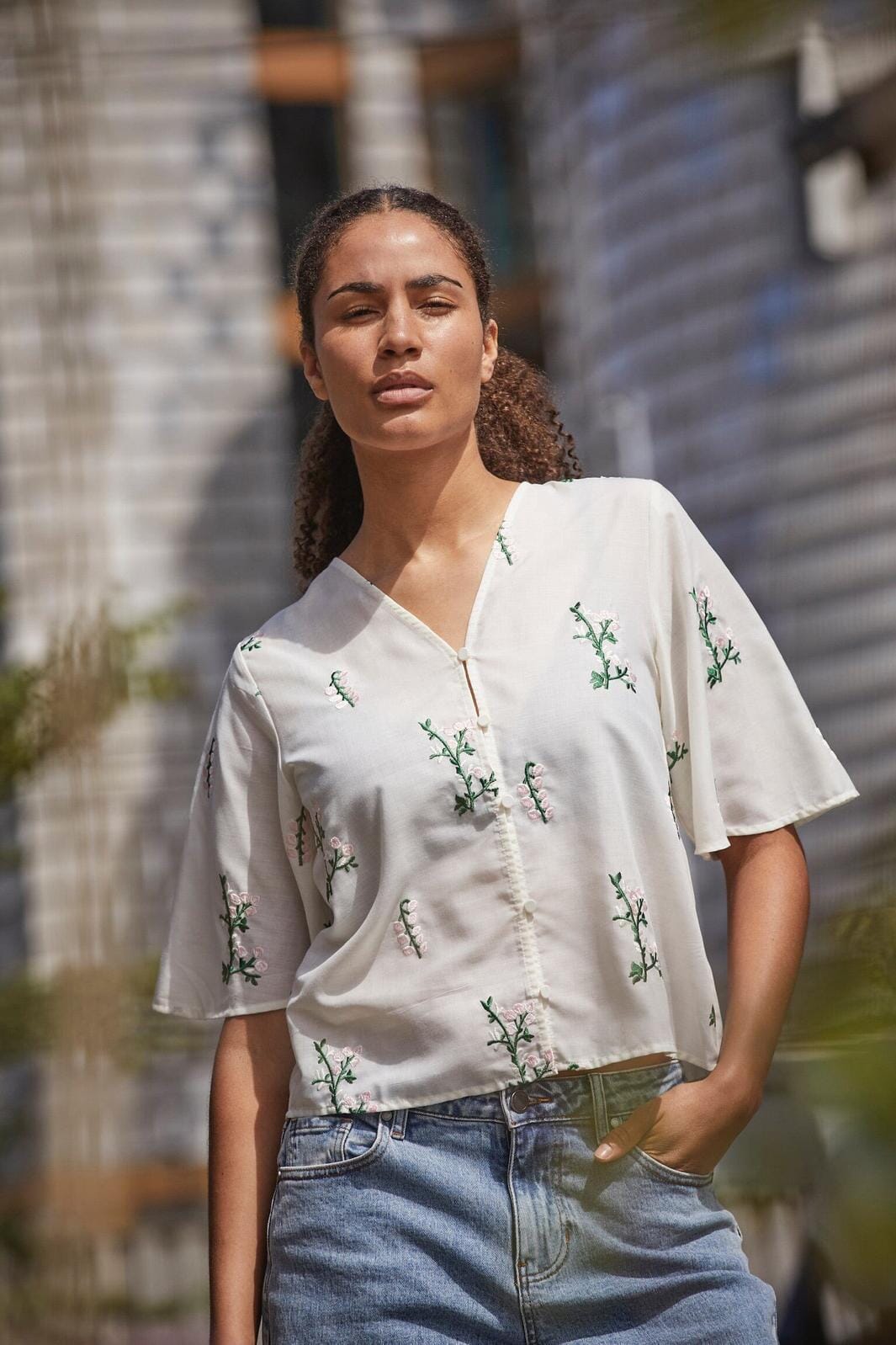 Crème-kleurige blouse van Love & Divine met geborduurde bloemen in roze en groene stelen. De blouse heeft een v-hals, knoopsluiting aan de voorkant en brede, korte mouwen.