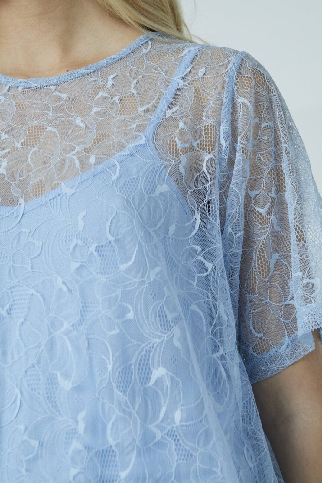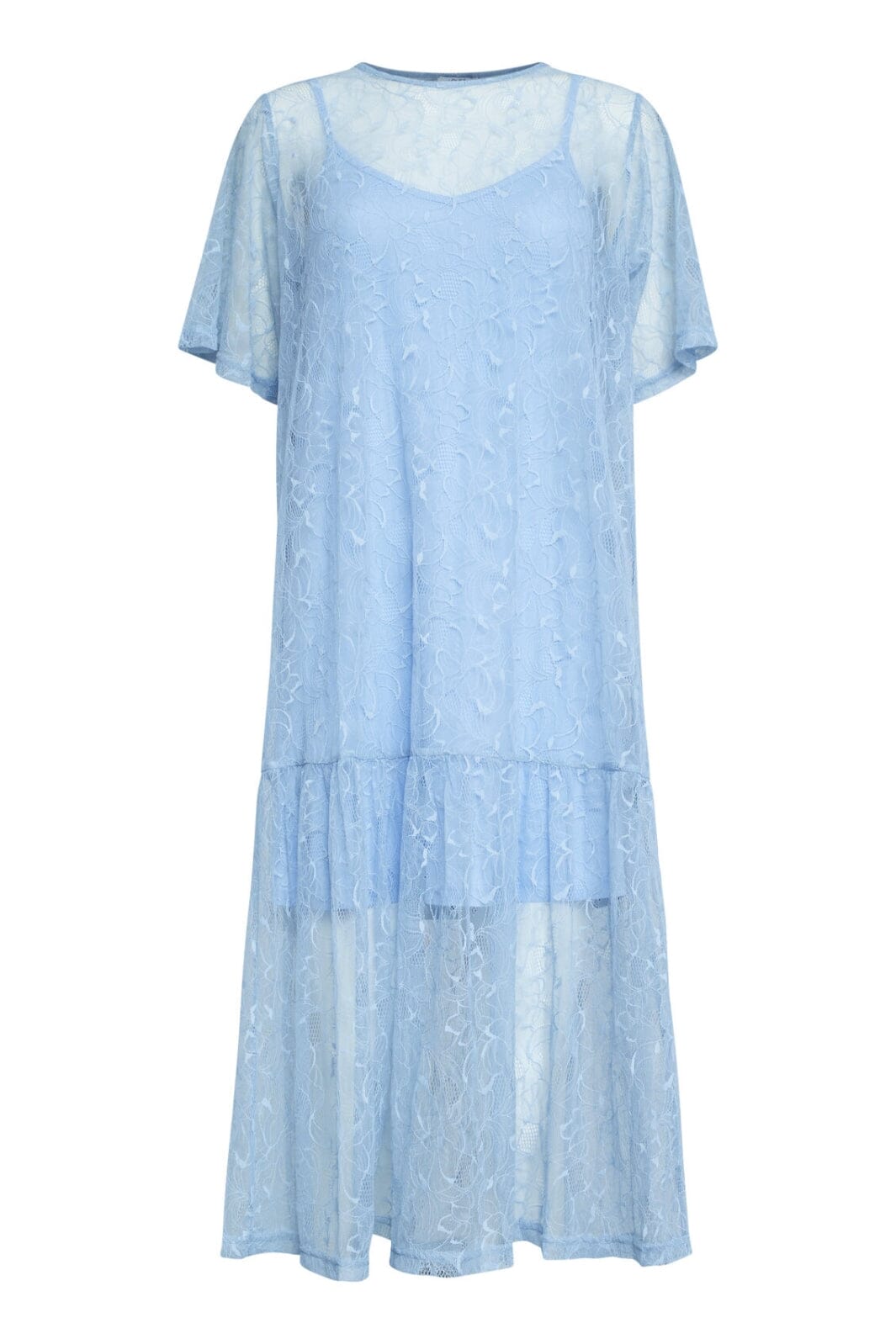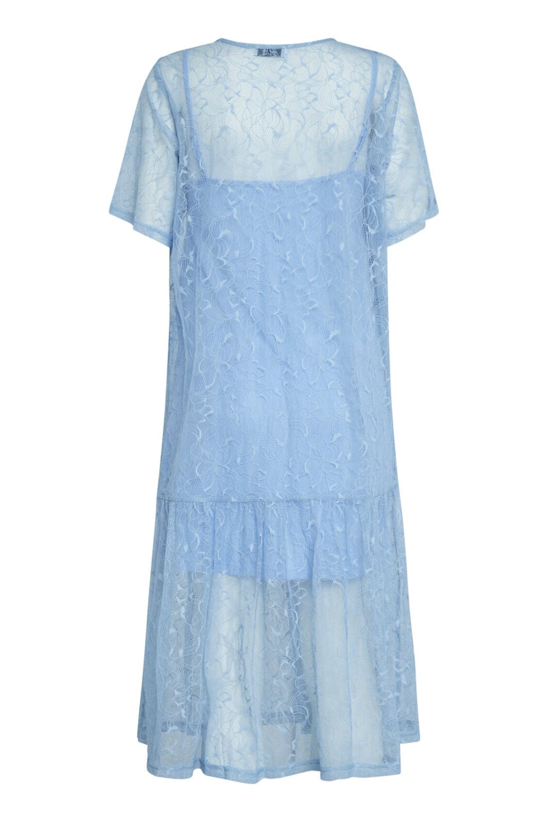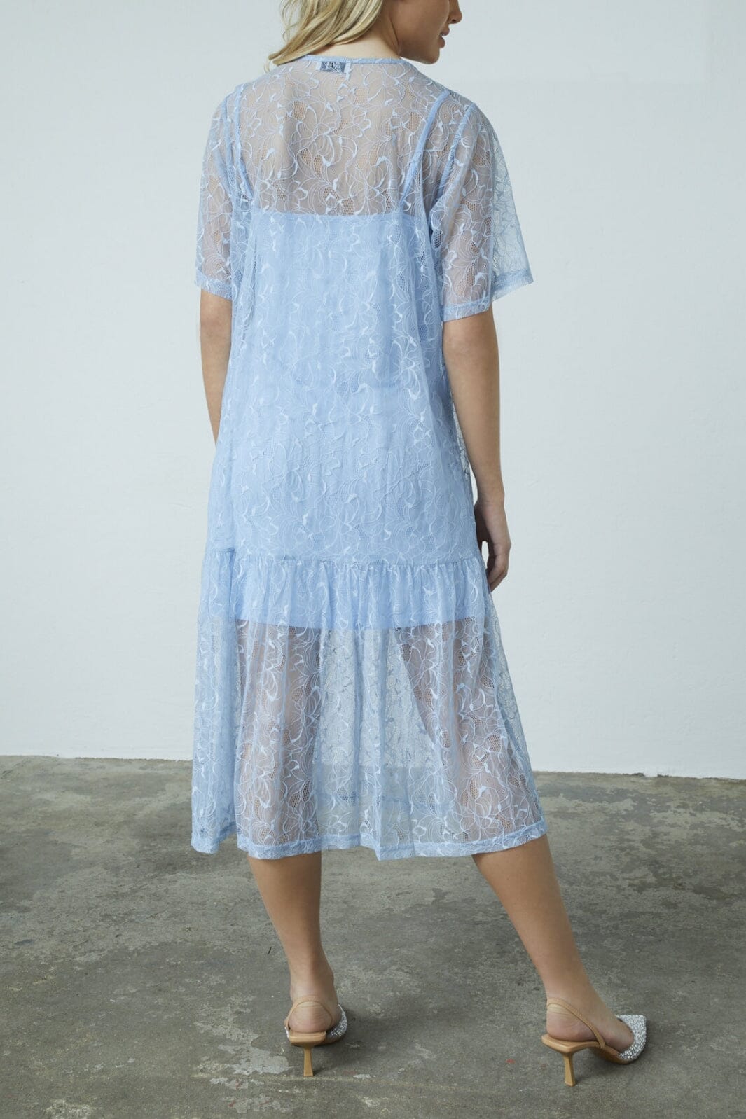 Lichtblau kantenjurk van Love & Divine met een losse pasvorm en gelaagd ontwerp. De jurk heeft een gebloemd kantenpatroon en komt tot halverwege het scheenbeen.