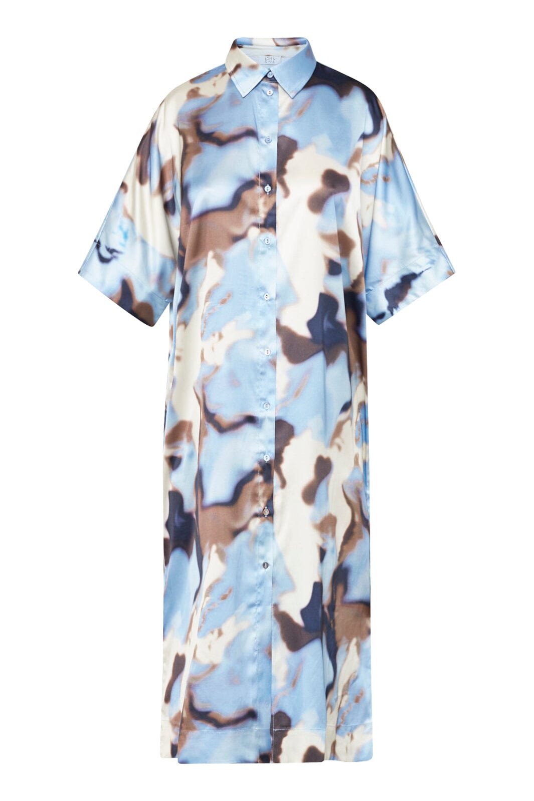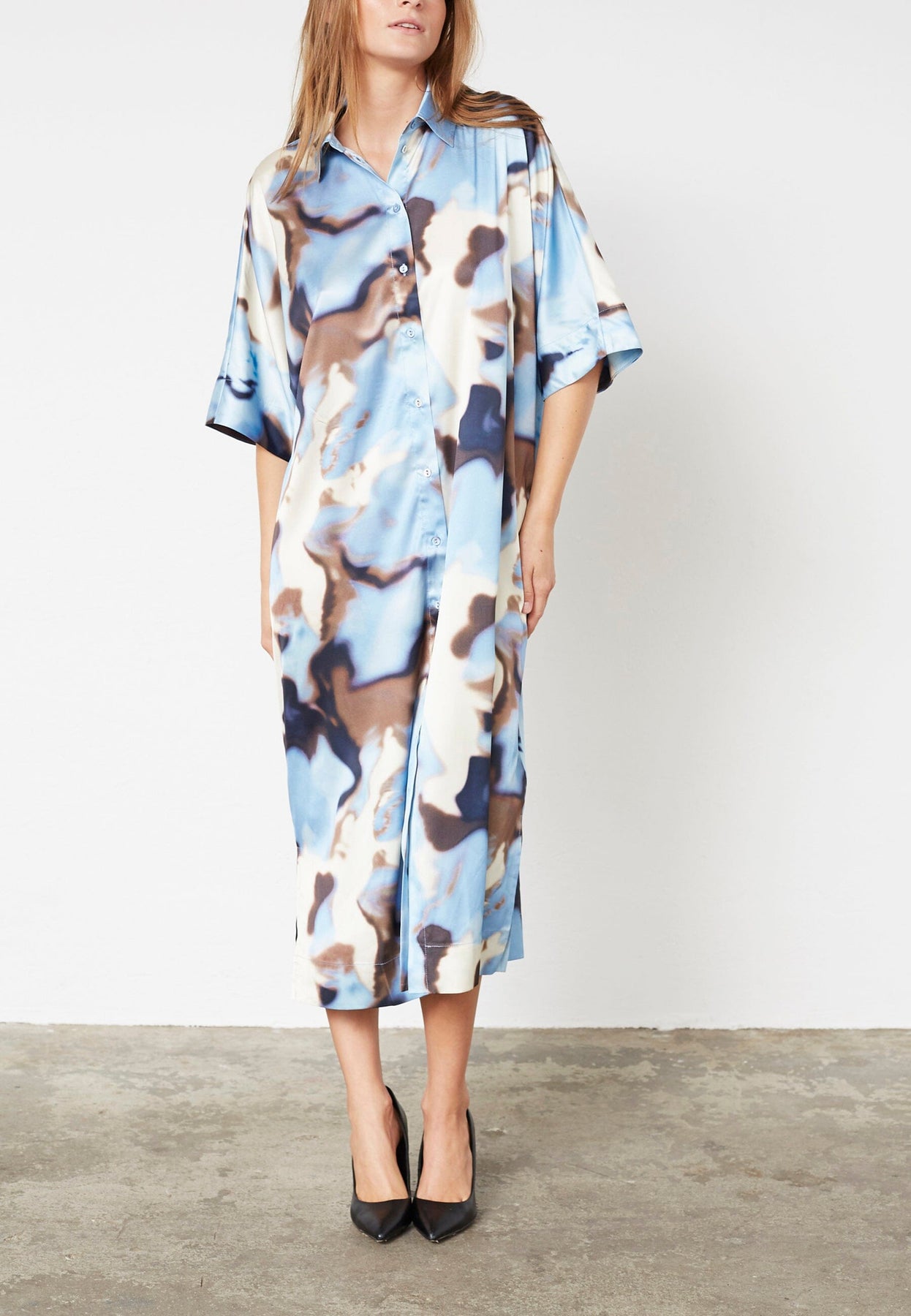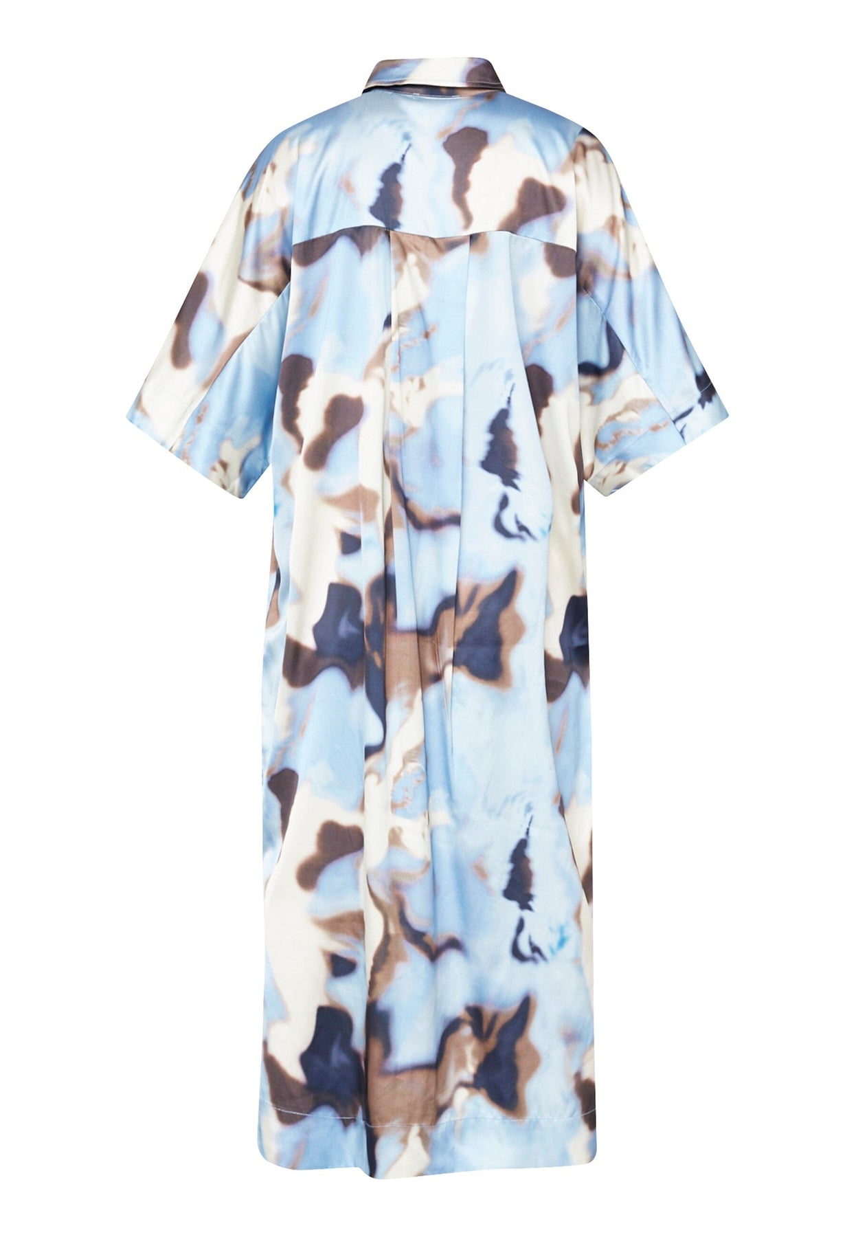 Een jurk van Love & Divine met een abstract patroon in blauwe, bruine en witte tinten. De jurk heeft een oversized pasvorm en is gemaakt van 100% polyester.