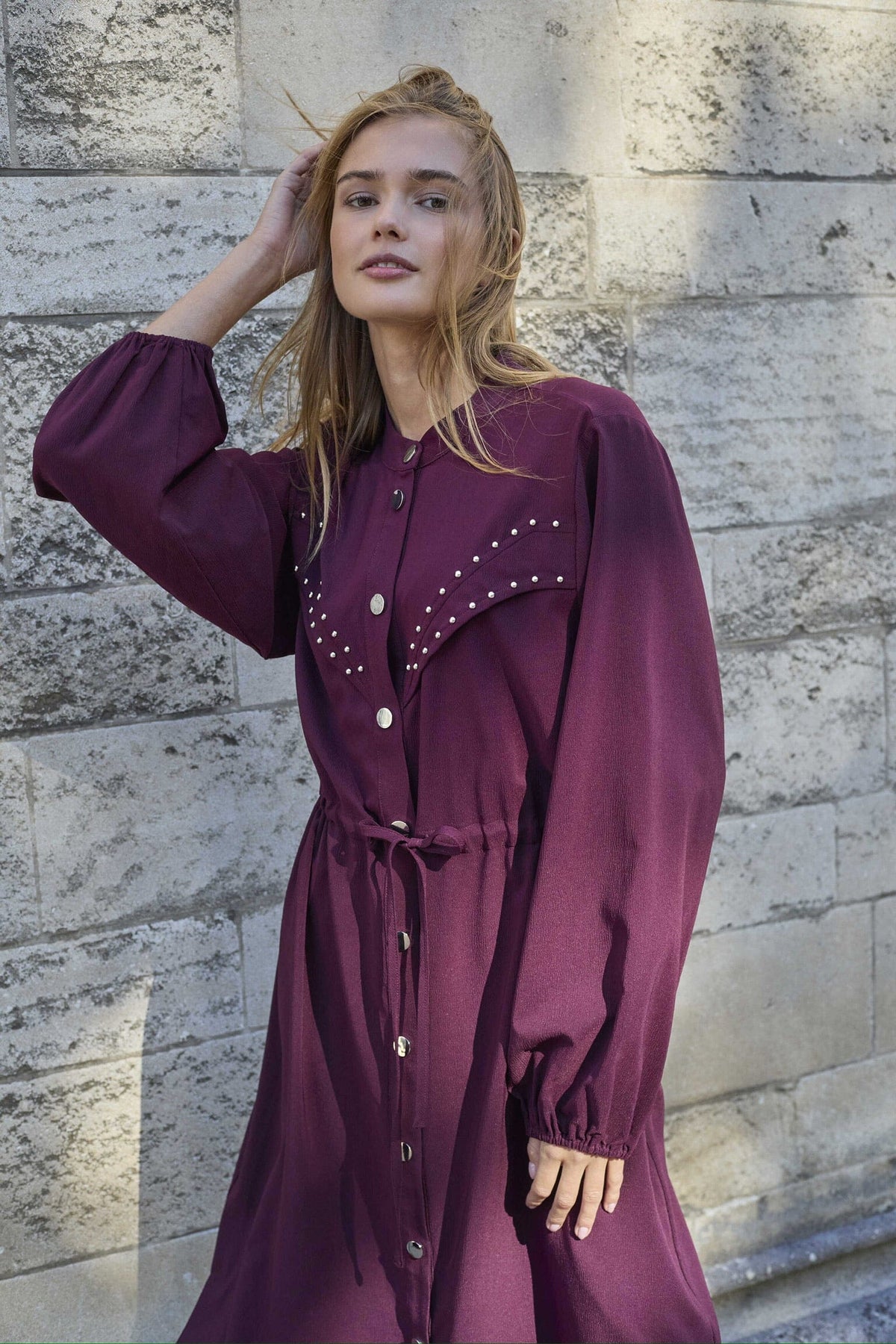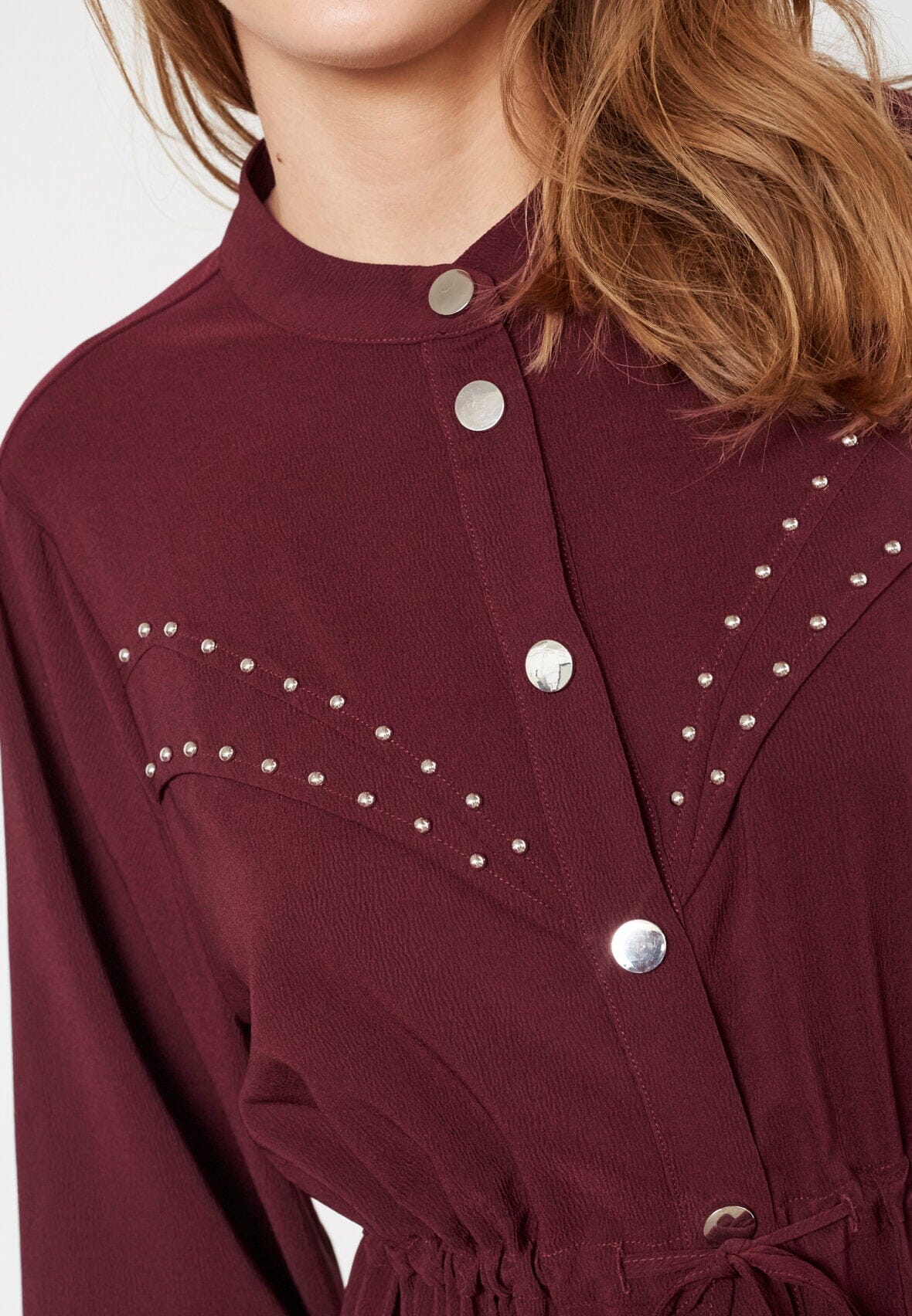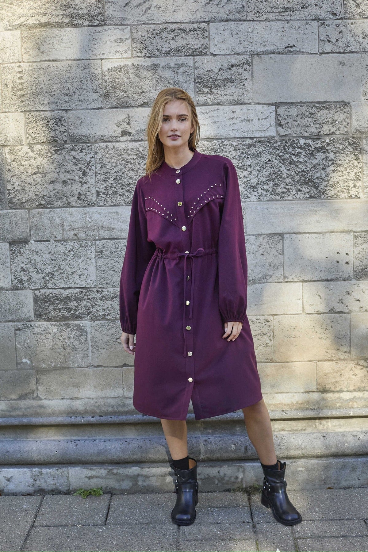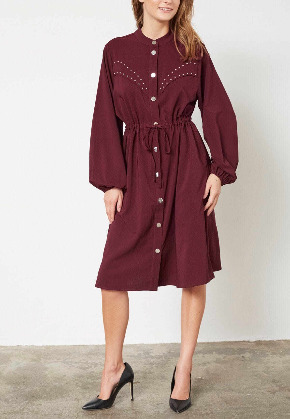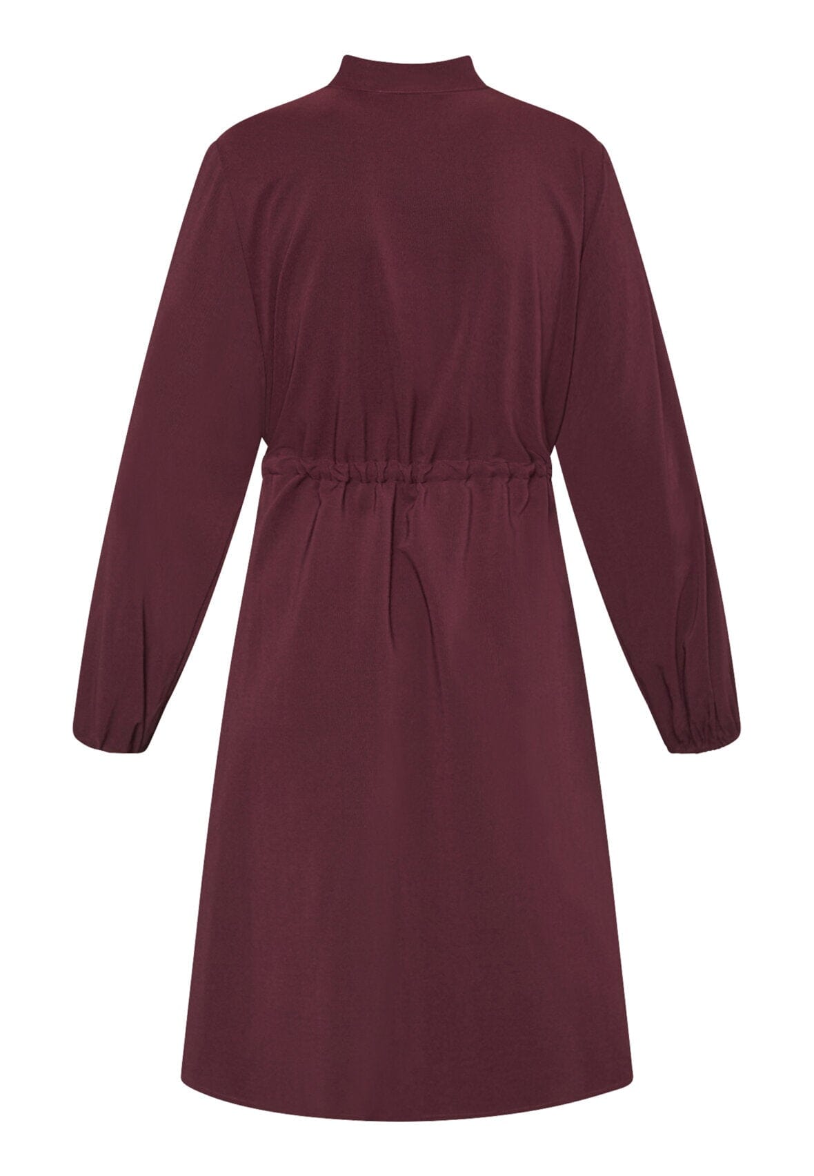 Jurk van Love & Divine in een diepe bordeauxkleur. De jurk heeft een hoge hals, lange mouwen en knielengte met knoopsluiting aan de voorkant.