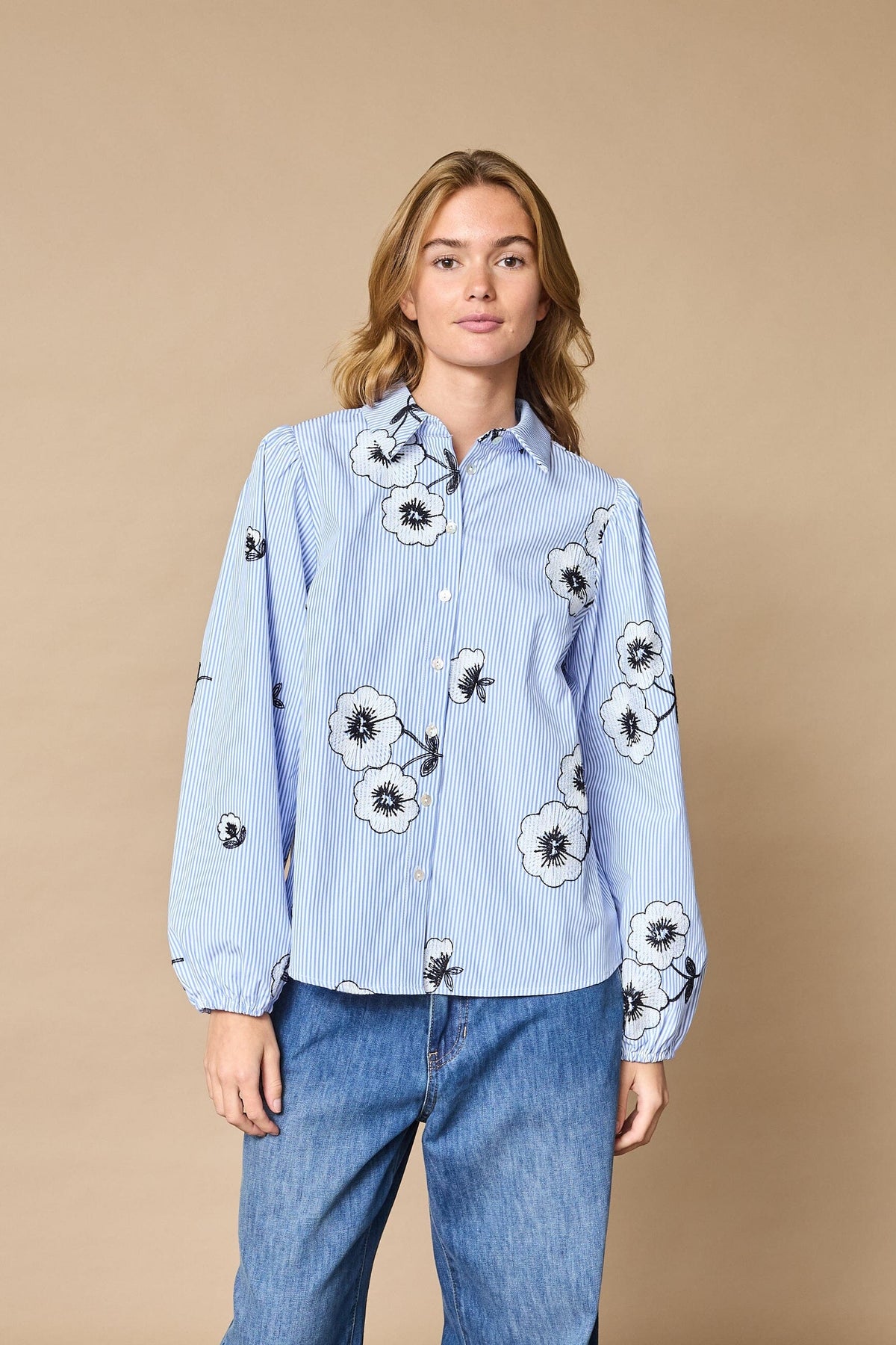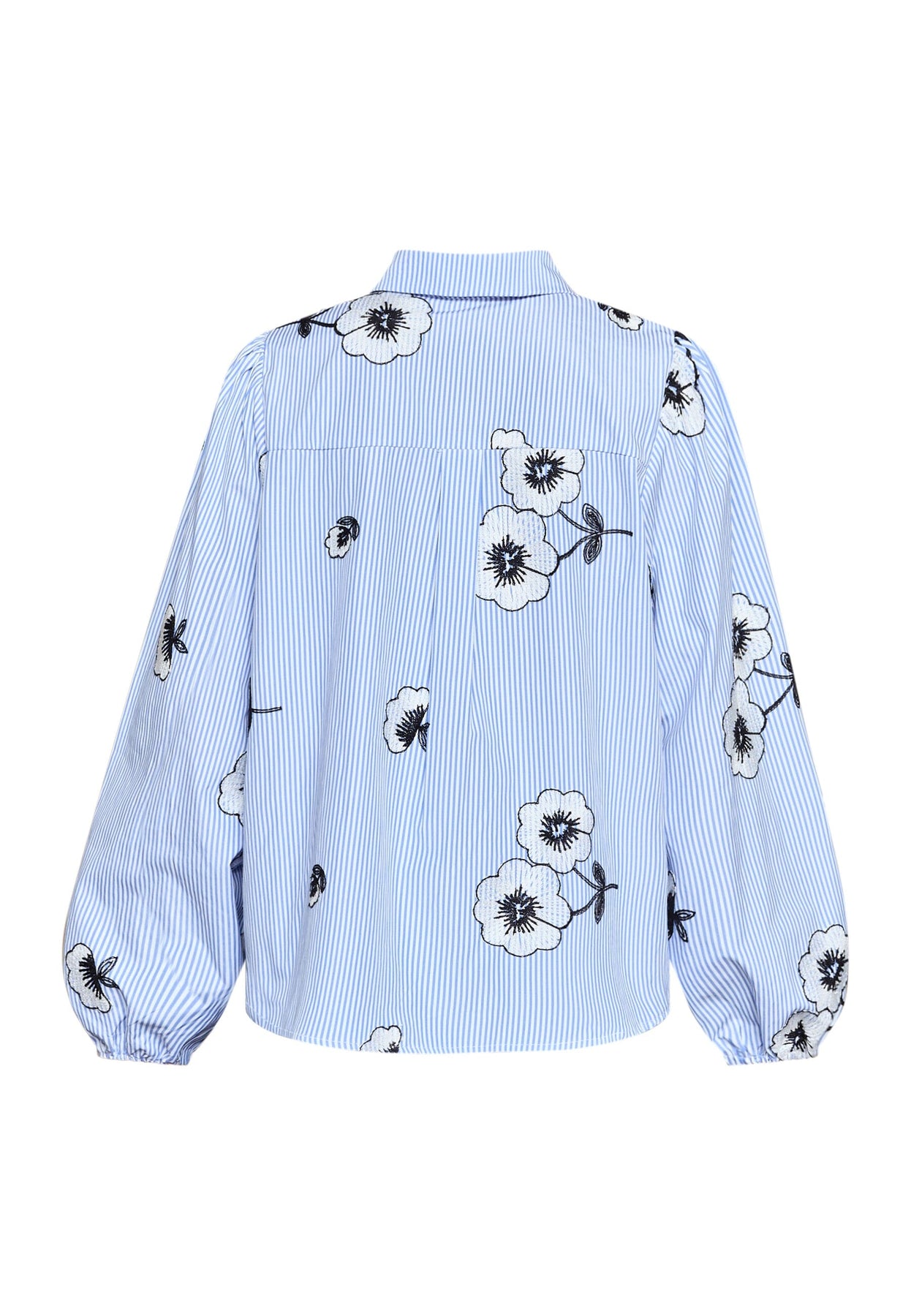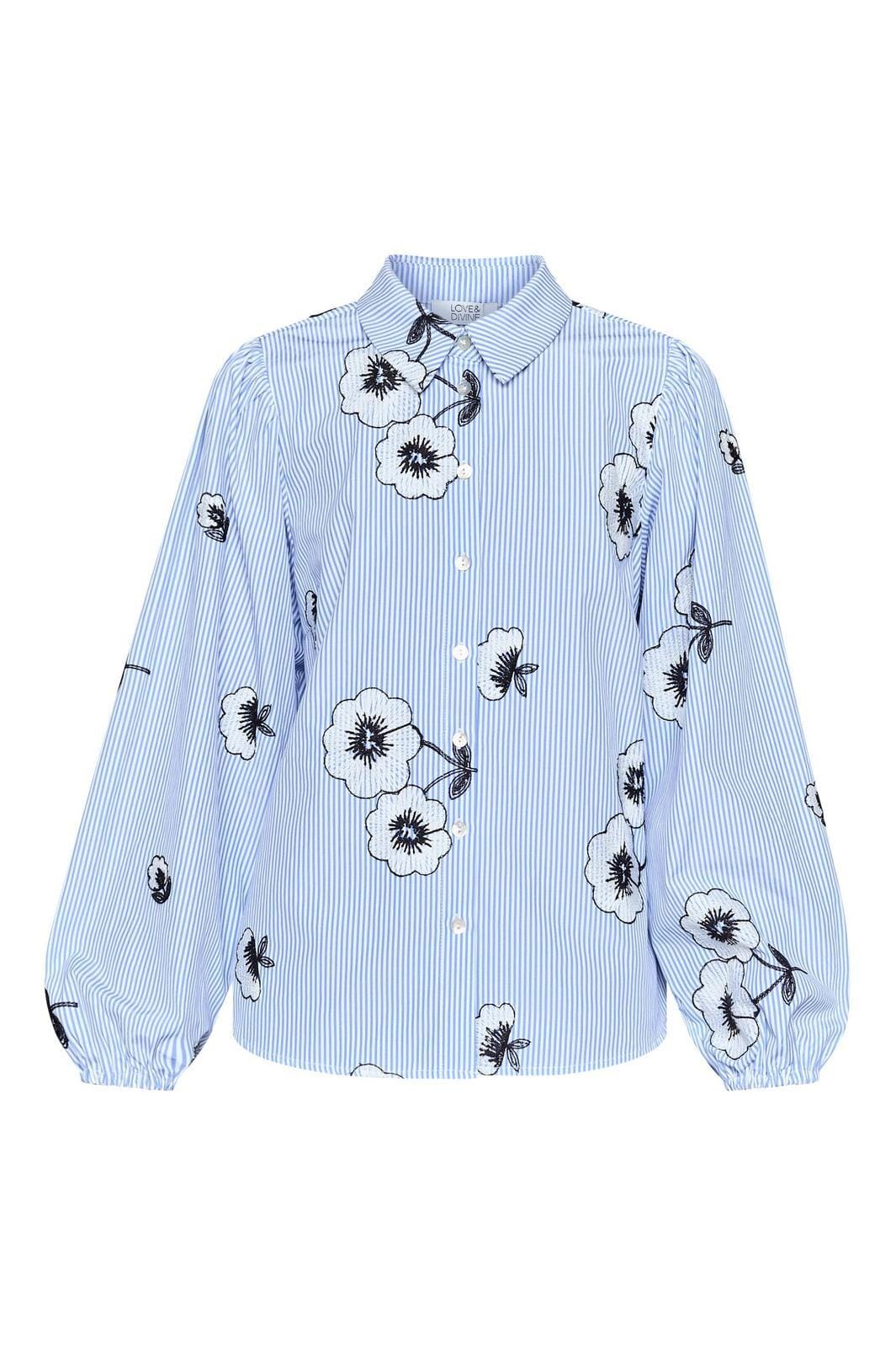Overhemd van Love & Divine met geborduurde bloemen op een gestreepte achtergrond in lichtblauw en wit. Het overhemd heeft lange mouwen en een losse pasvorm.