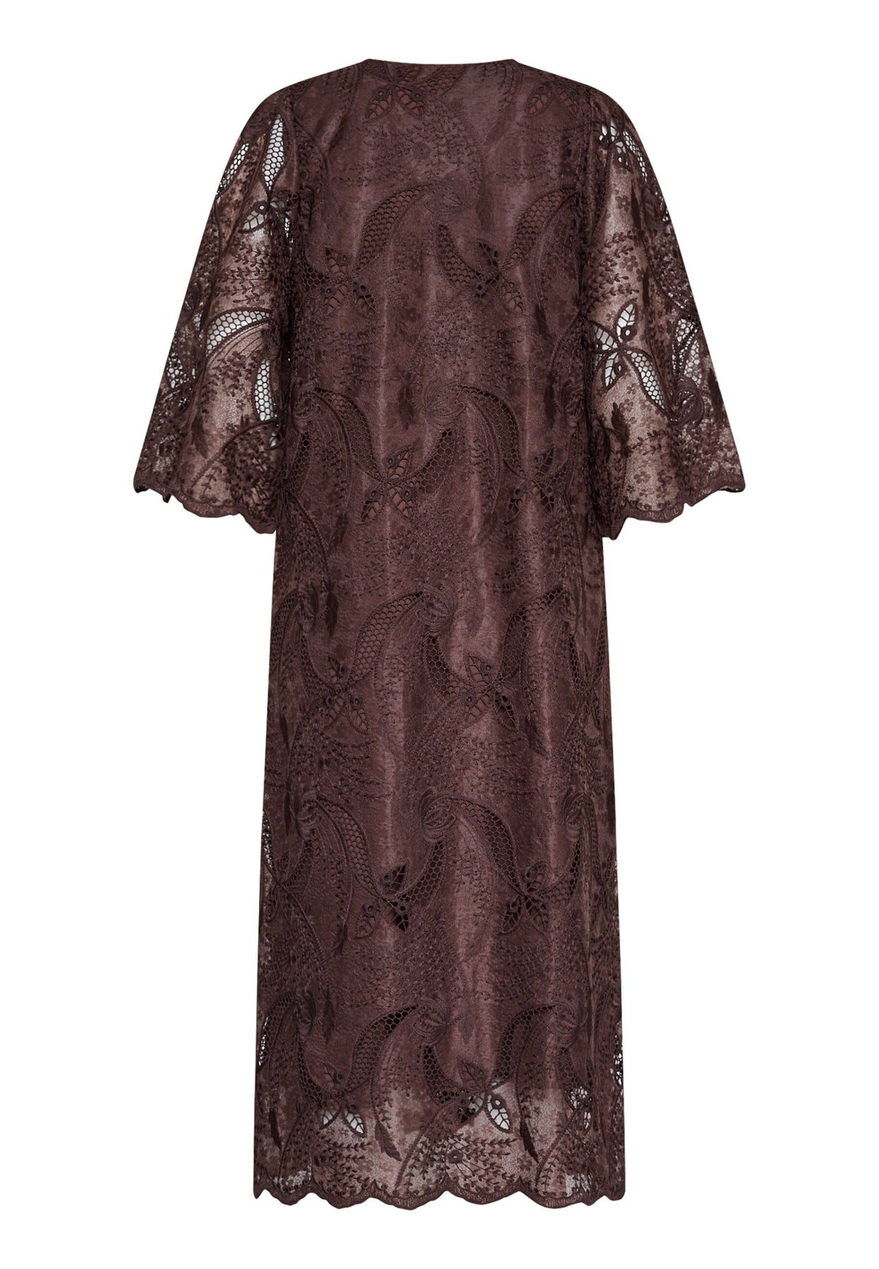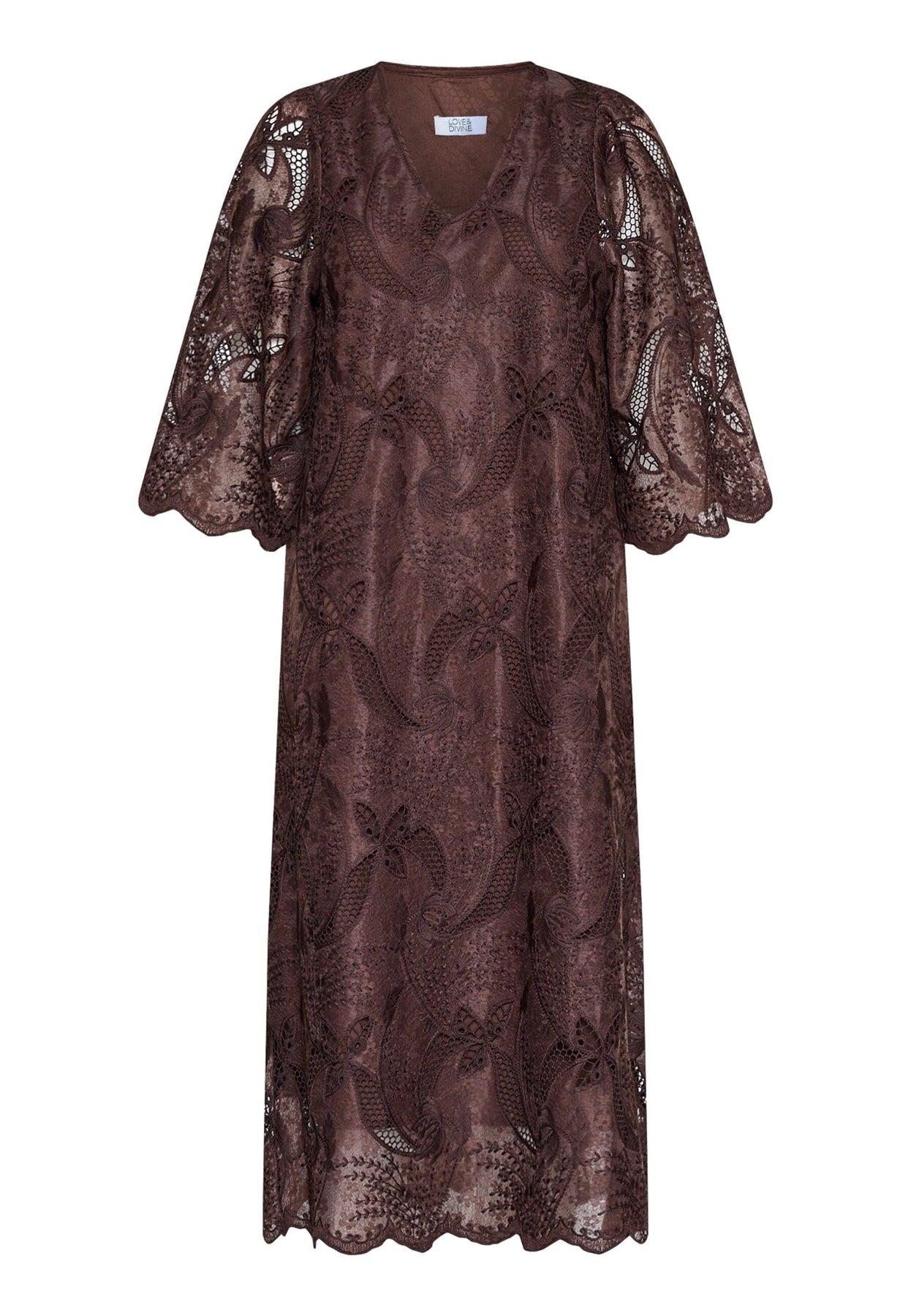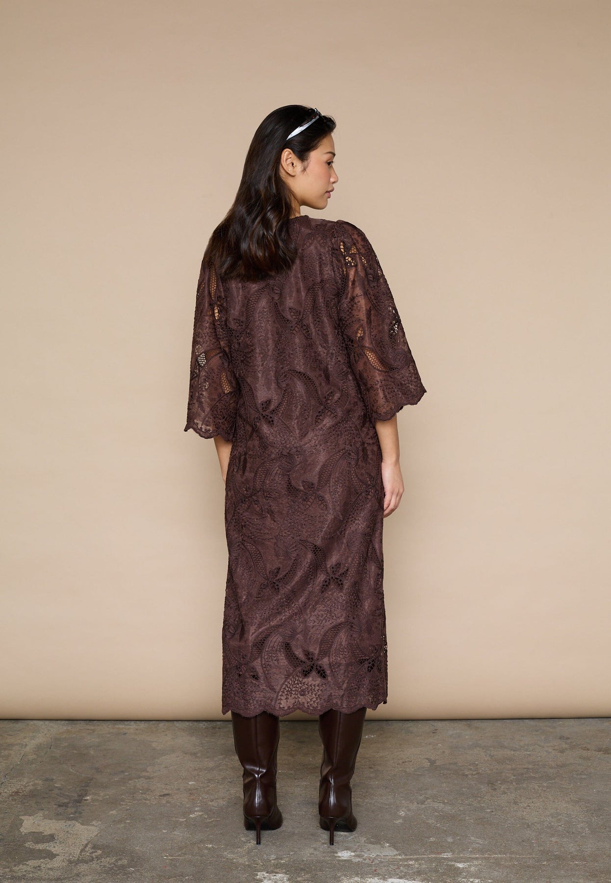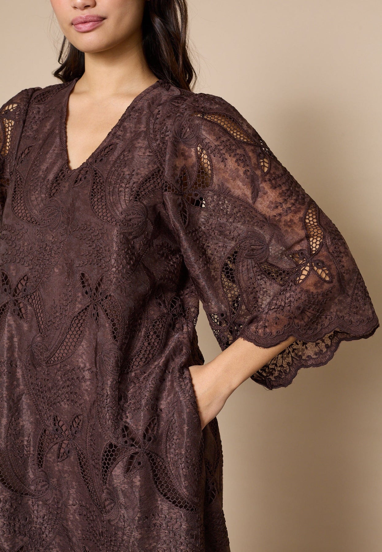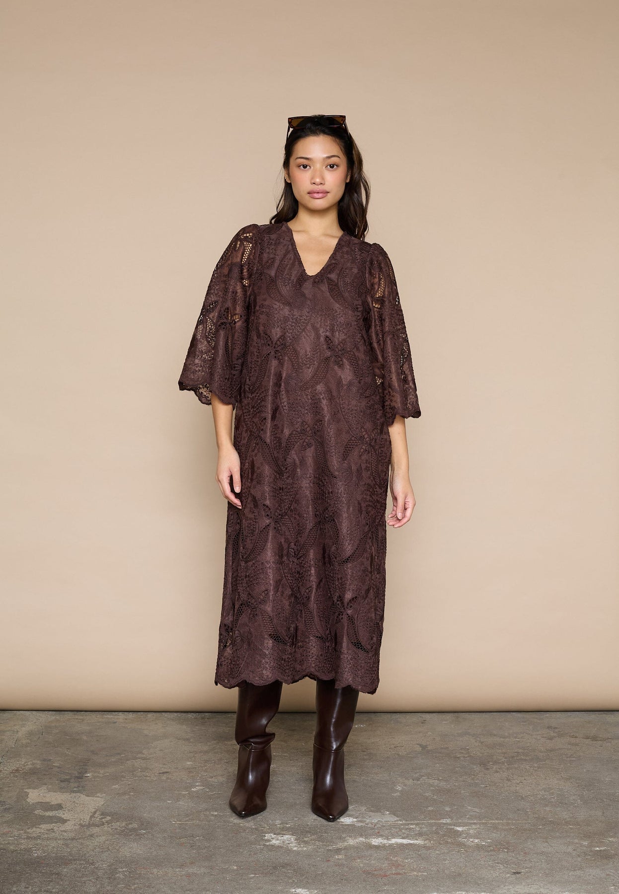Bruine jurk van Love & Divine met borduursel en kant. De jurk heeft driekwartmouwen, een V-hals en een bloemen- en paisleypatroon.