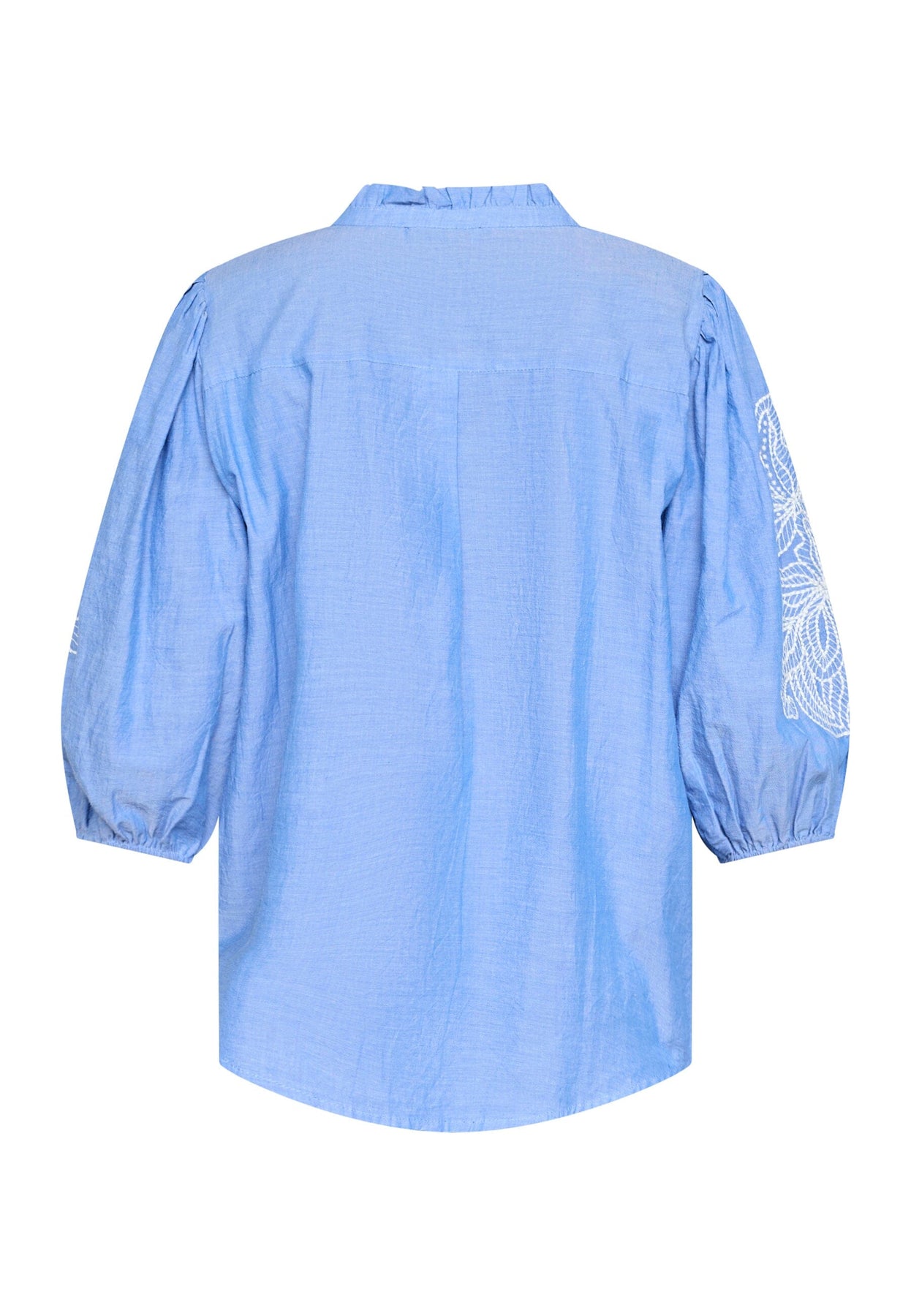 Blau shirt van Love & Divine met witte bloemenborduursels. Het shirt is gemaakt van 100% katoen en heeft een losse pasvorm met 3/4-mouwen met puff.