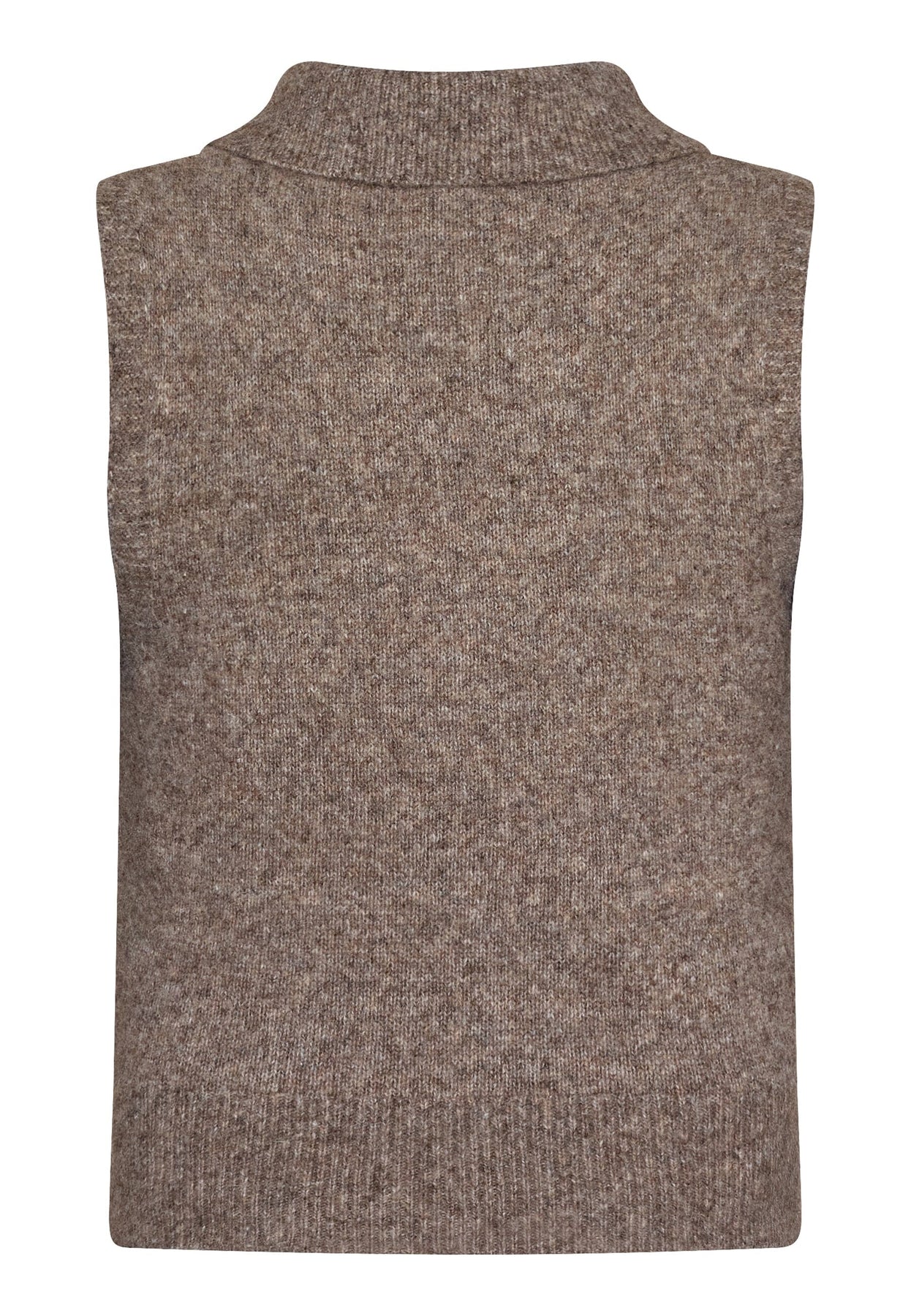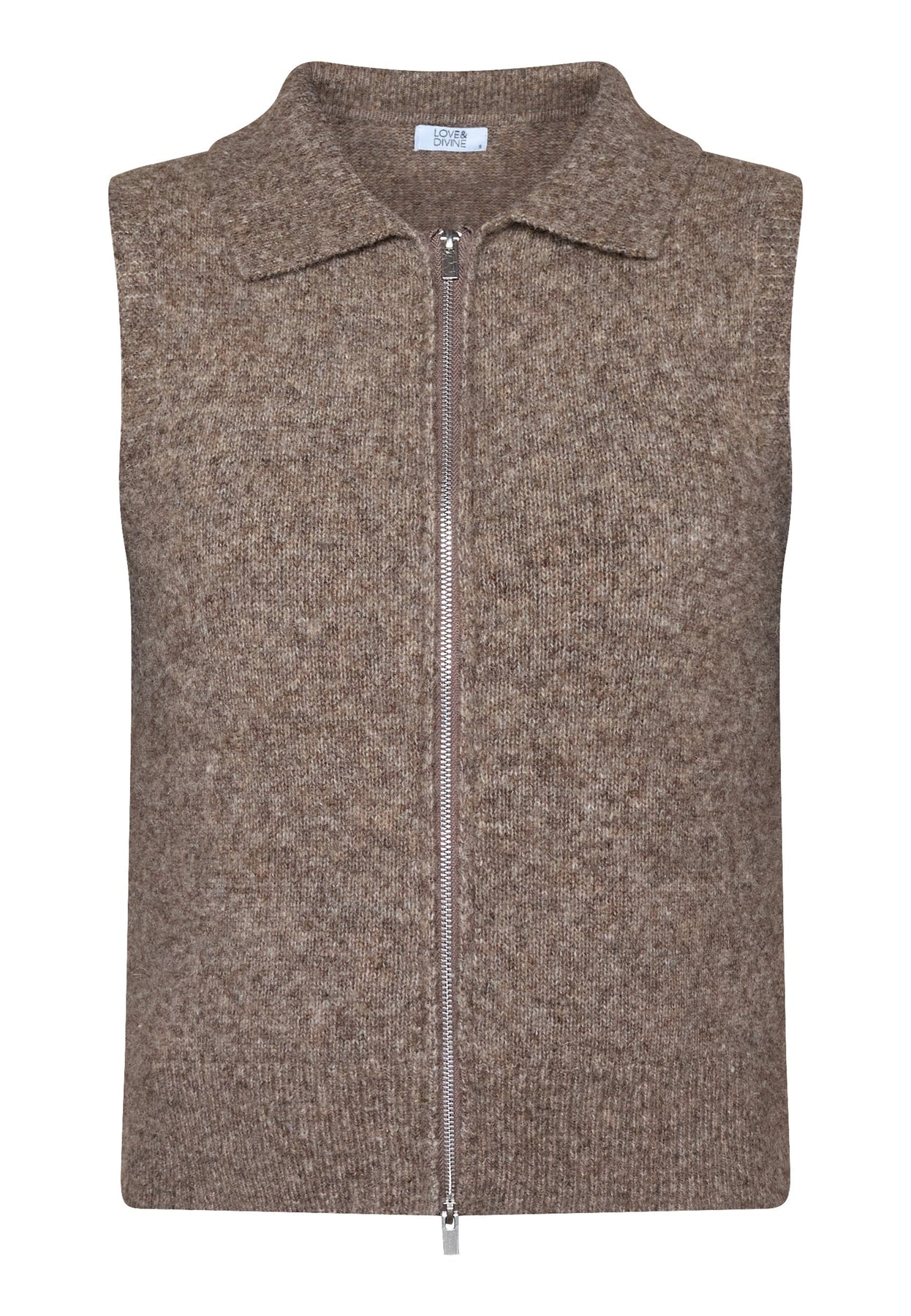 Mouwloos gebreid vest van Love & Divine in een bruin gemêleerde kleur. Het vest heeft een polokraag en een ritssluiting over de volledige lengte aan de voorkant.