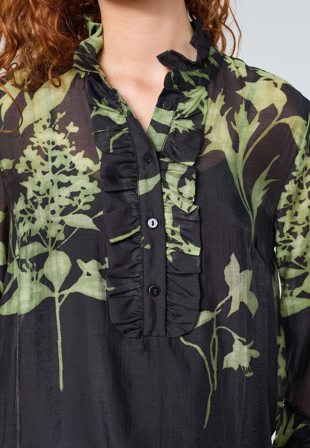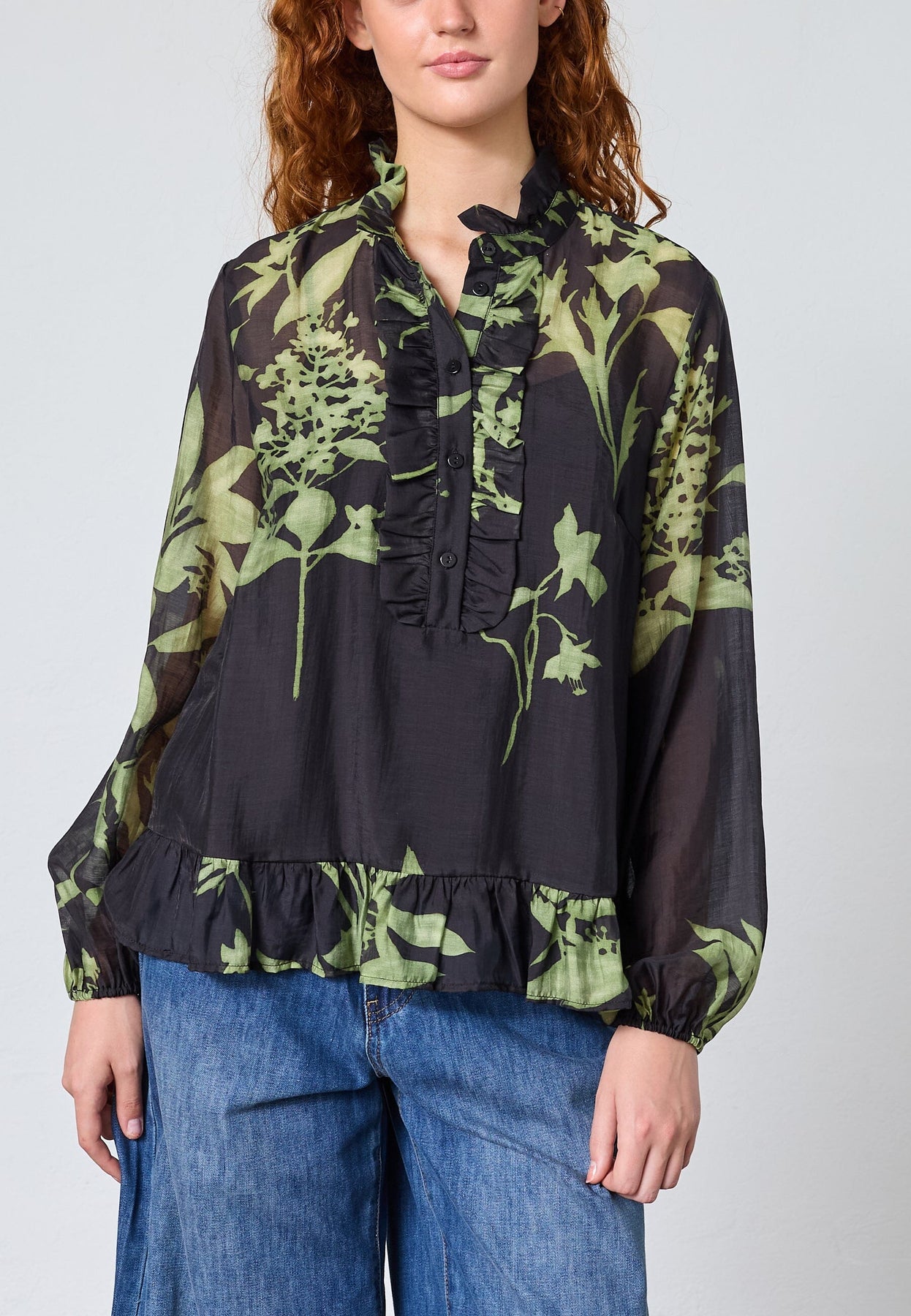 Blouse van Love & Divine met een hoge hals en groene bloemenprint op een donkere achtergrond. De blouse heeft ruches bij de hals en lange mouwen met plooien.