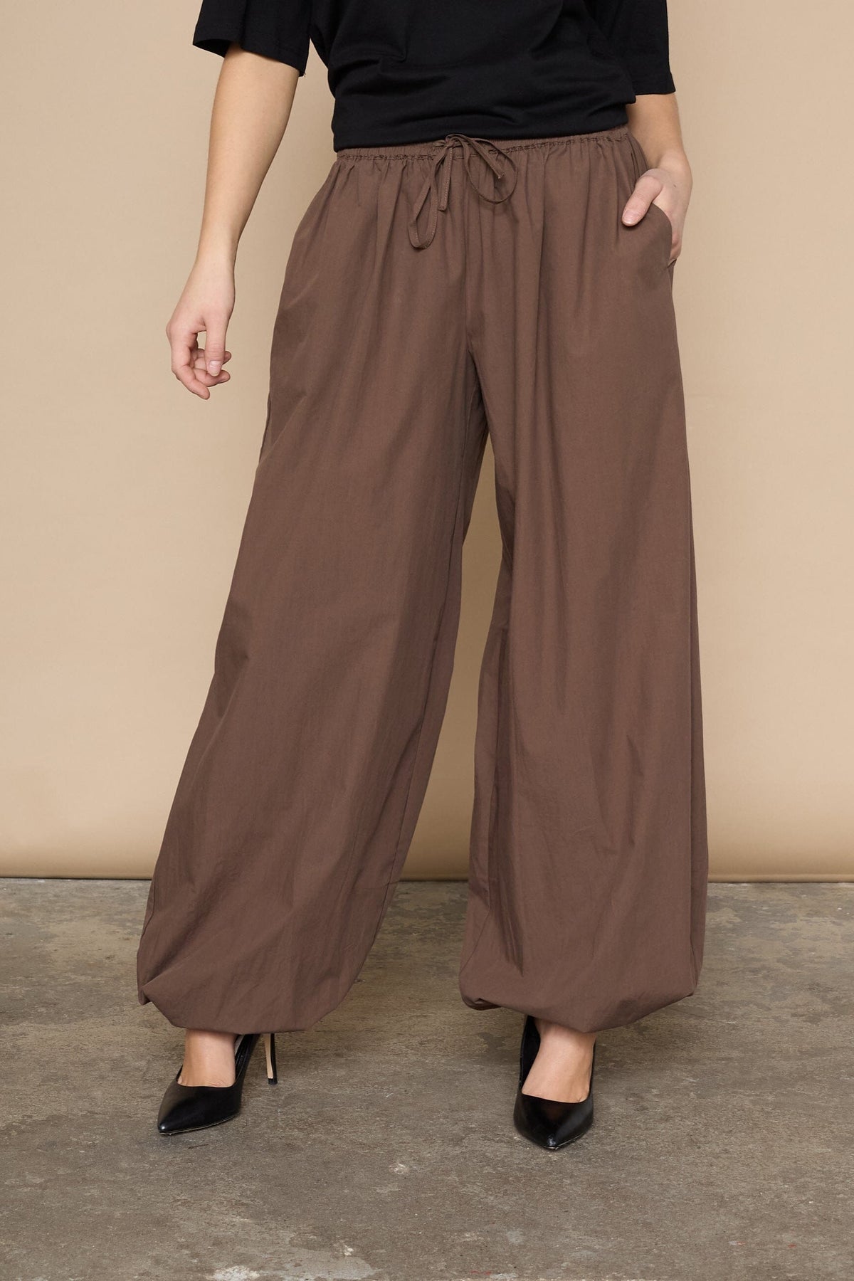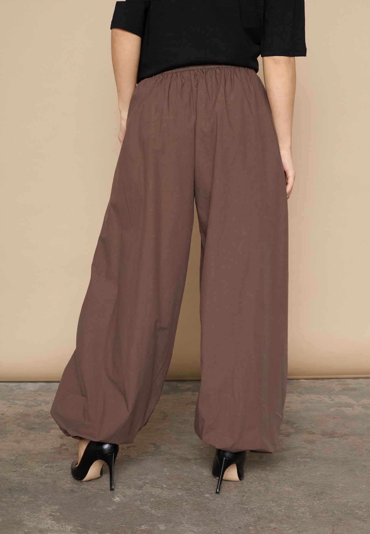 Donkerbruine broek van Love & Divine, gemaakt van katoen. De broek heeft wijde pijpen en een losse pasvorm met elastiek en trekkoord in de taille.