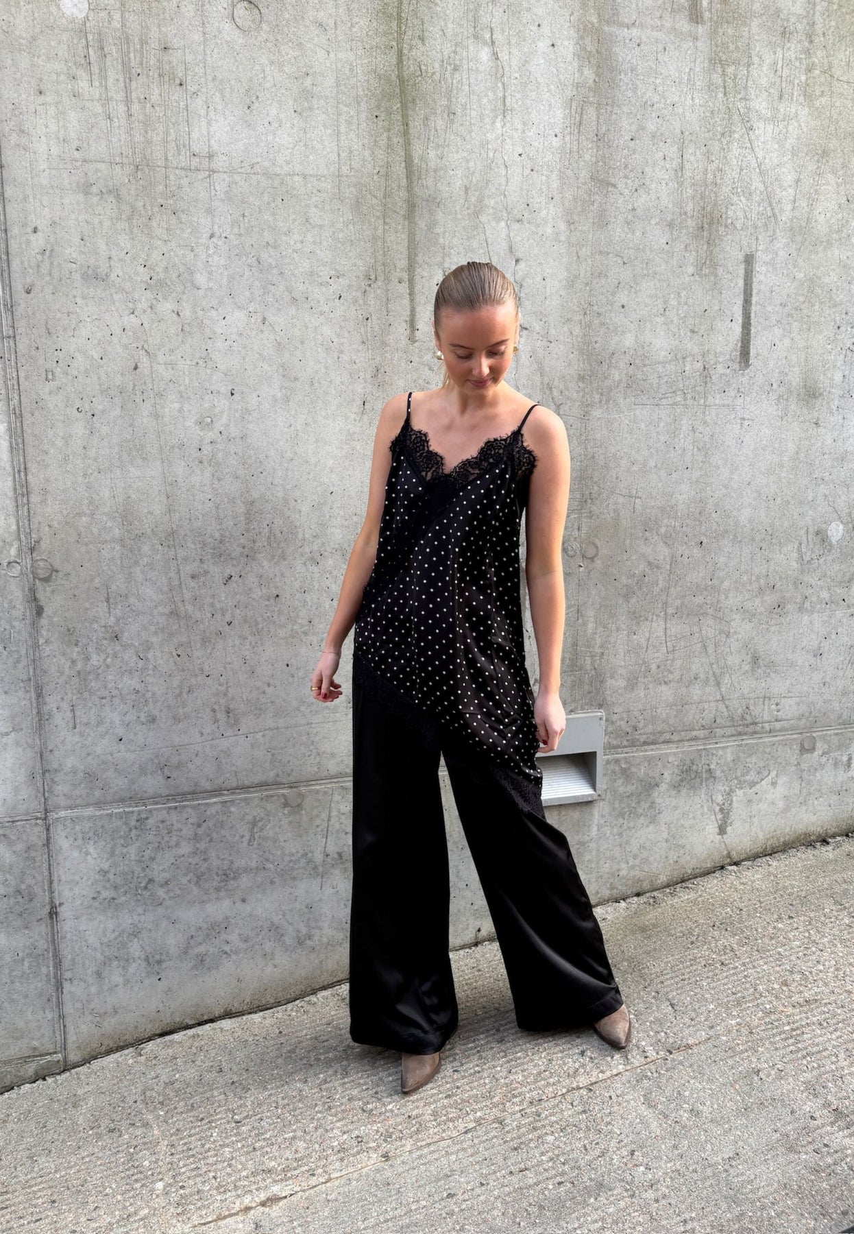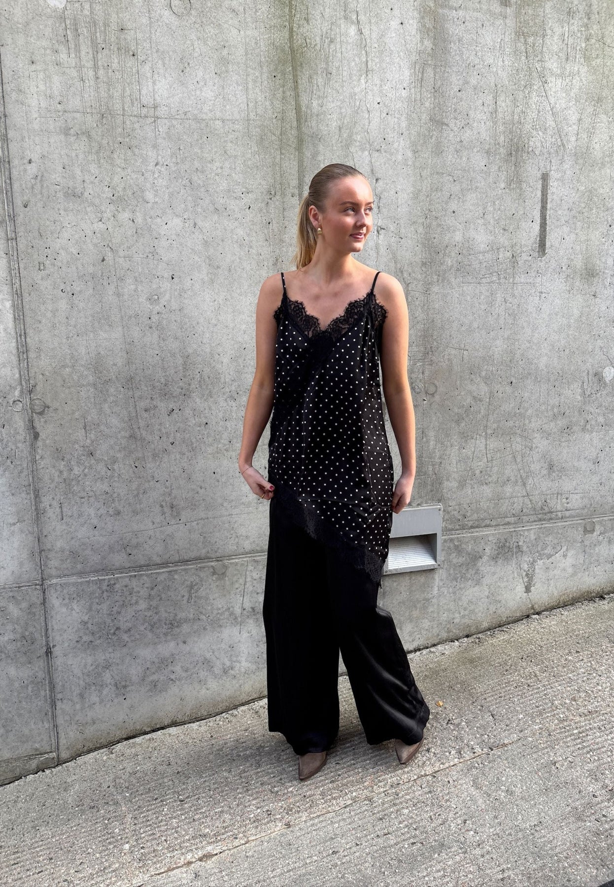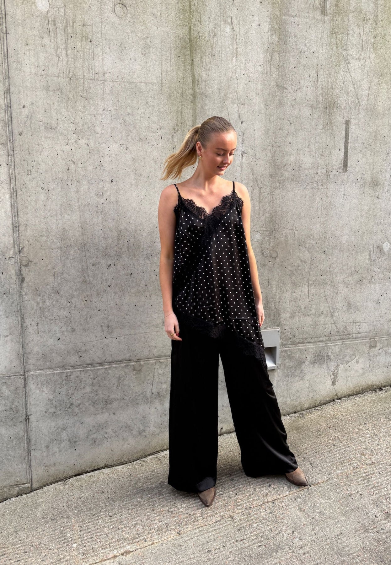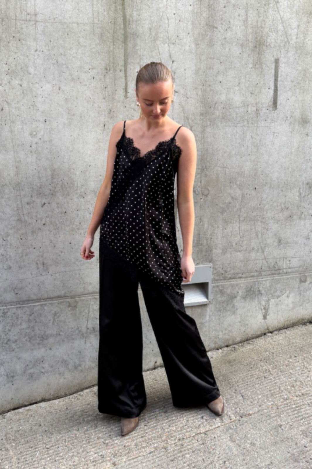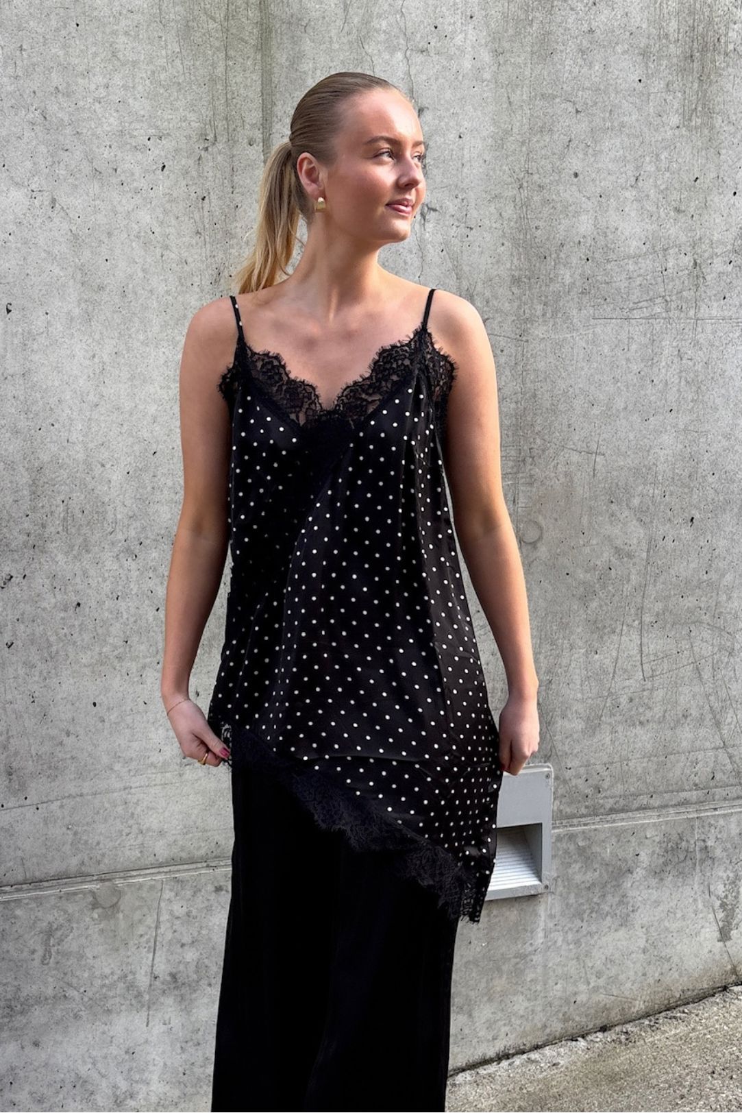 Zwart topje van Love & Divine met witte stippen. Het topje heeft dunne spaghettibandjes en een asymmetrische kanten zoom aan de onderkant.