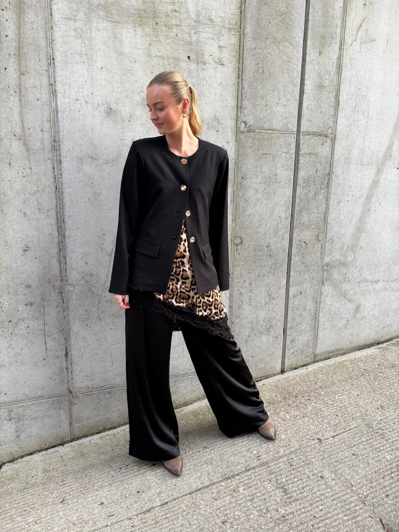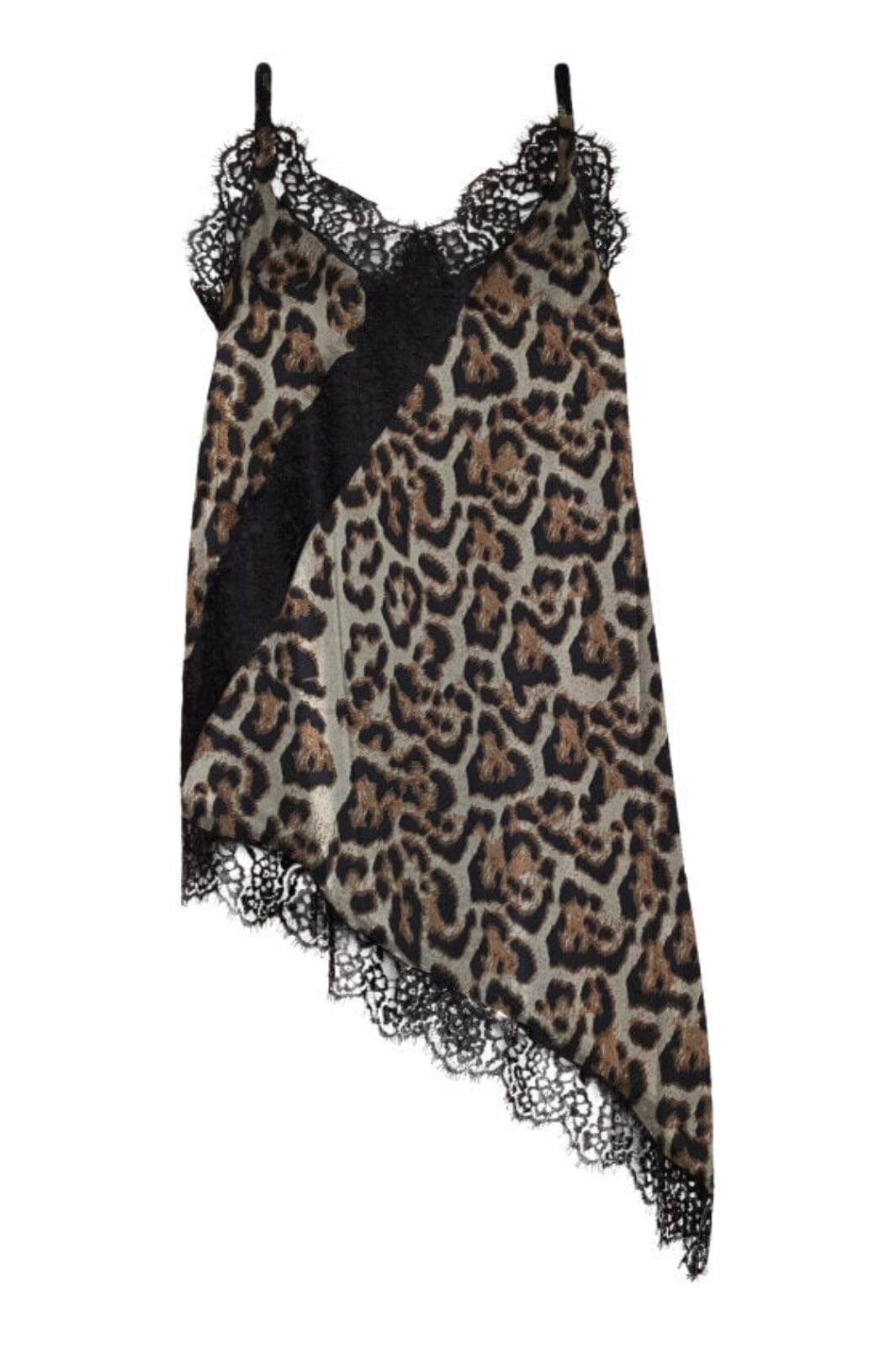 Top van Love & Divine met een luipaardprint in bruine en beige tinten op een zwarte achtergrond. De top heeft kanten afwerkingen en een asymmetrisch design met een schuine zoom.