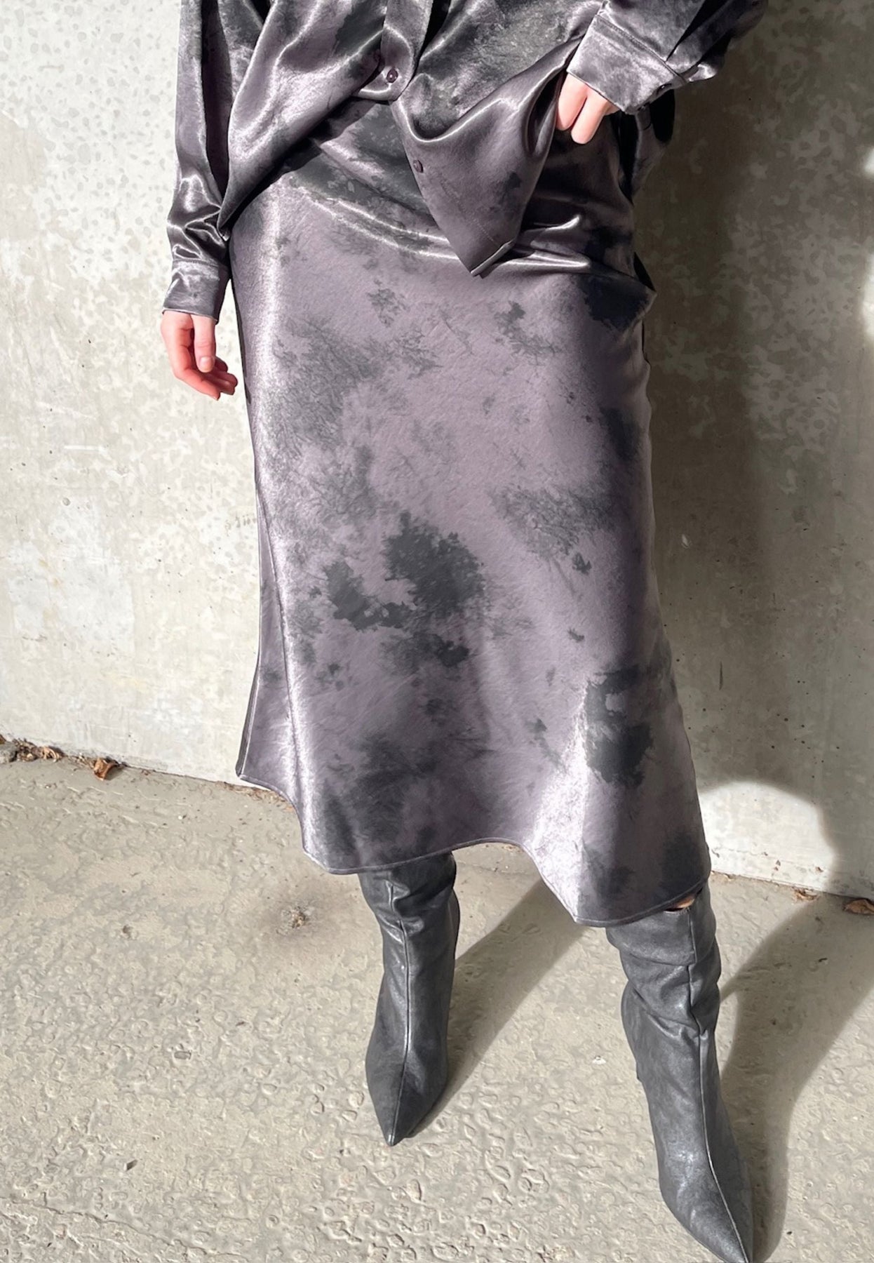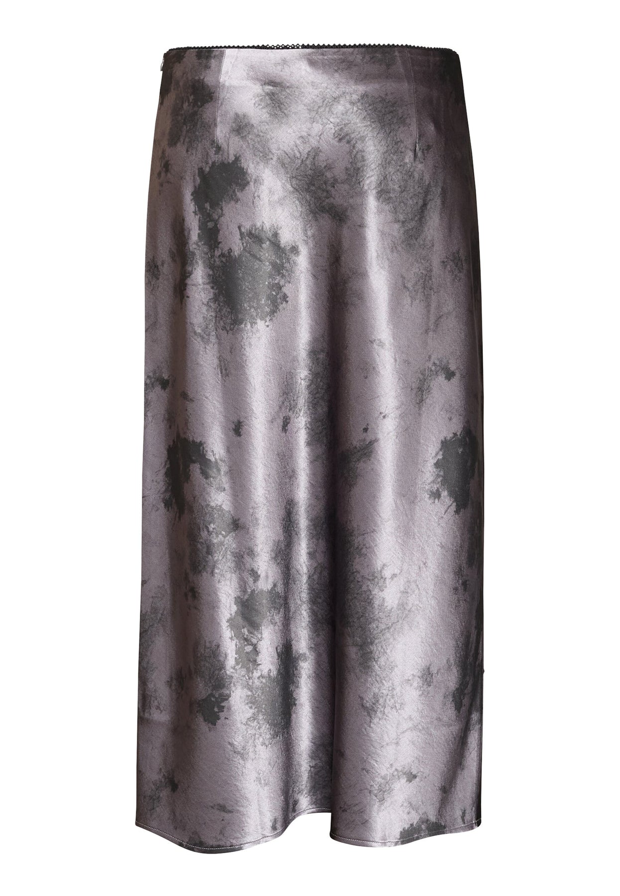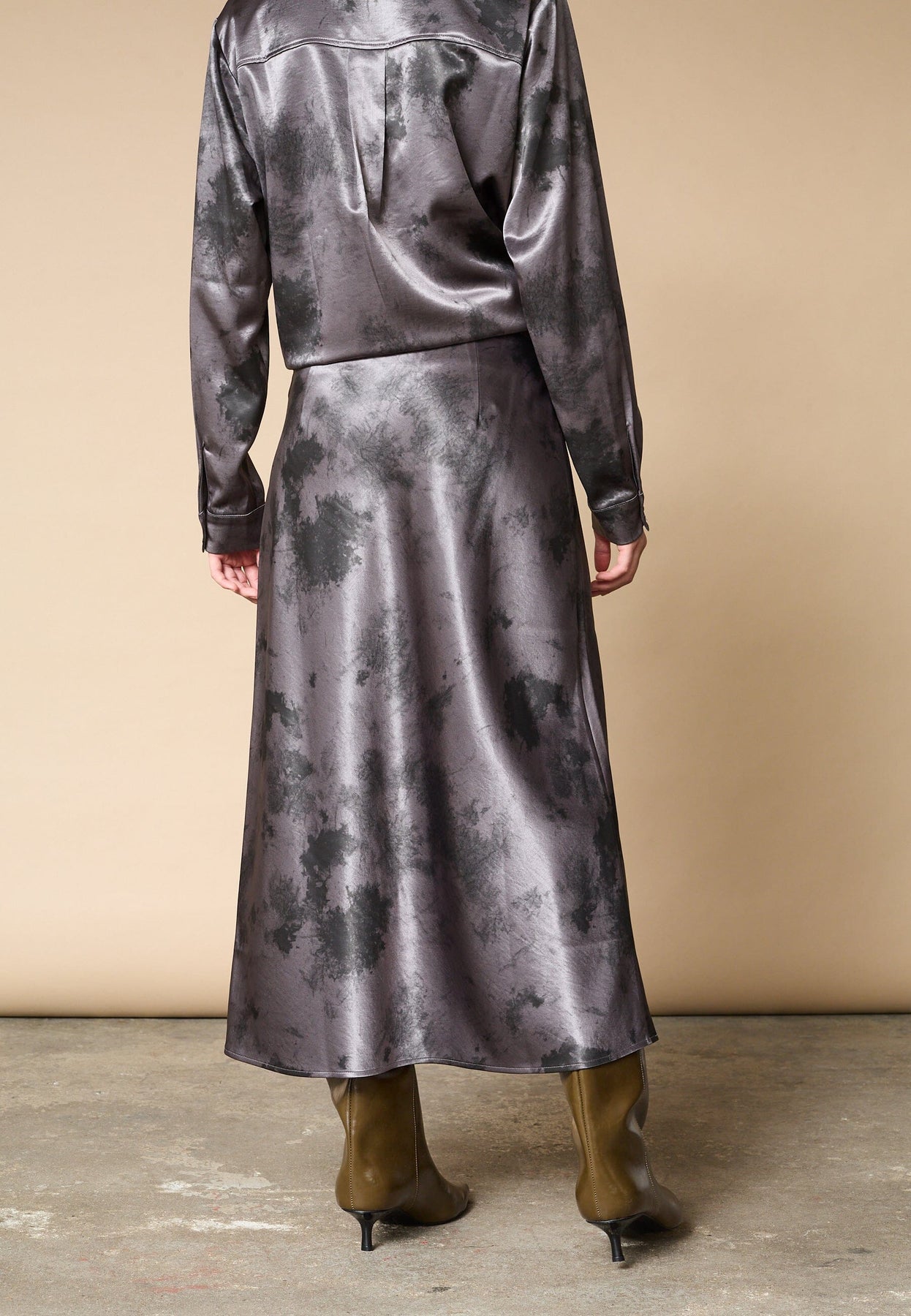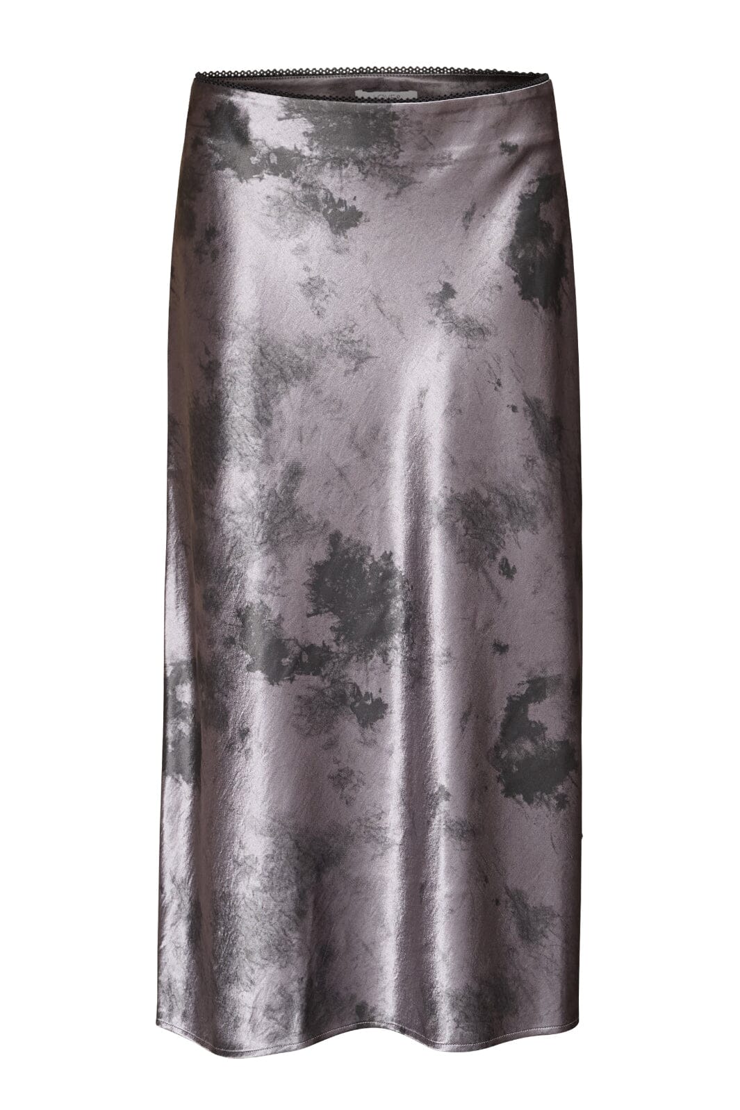 Rok van Love & Divine in grijze en zilverkleurige tinten met een gemarmerd acid wash-patroon in glanzend polyester.
