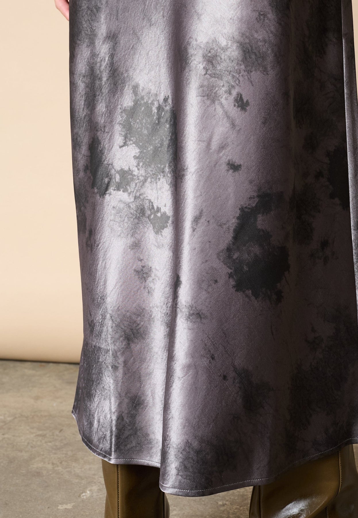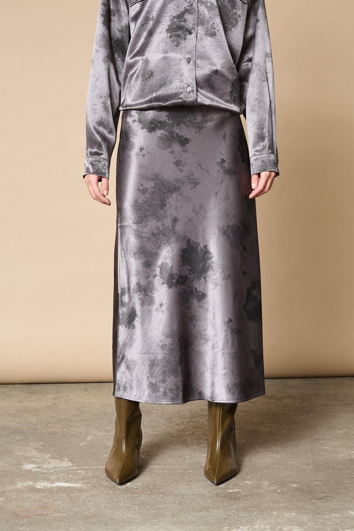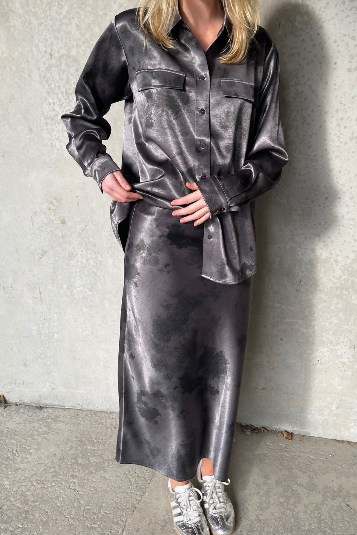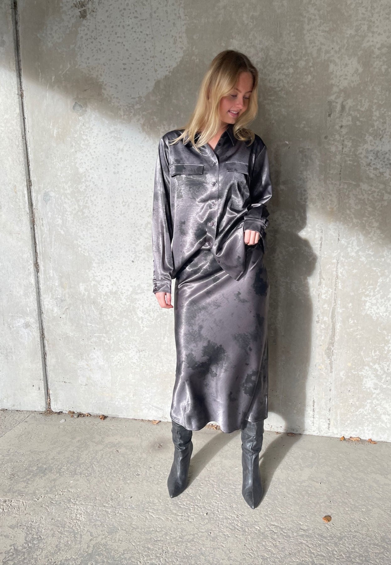 Rok van Love & Divine in grijze en zilverkleurige tinten met een gemarmerd acid wash-patroon in glanzend polyester.