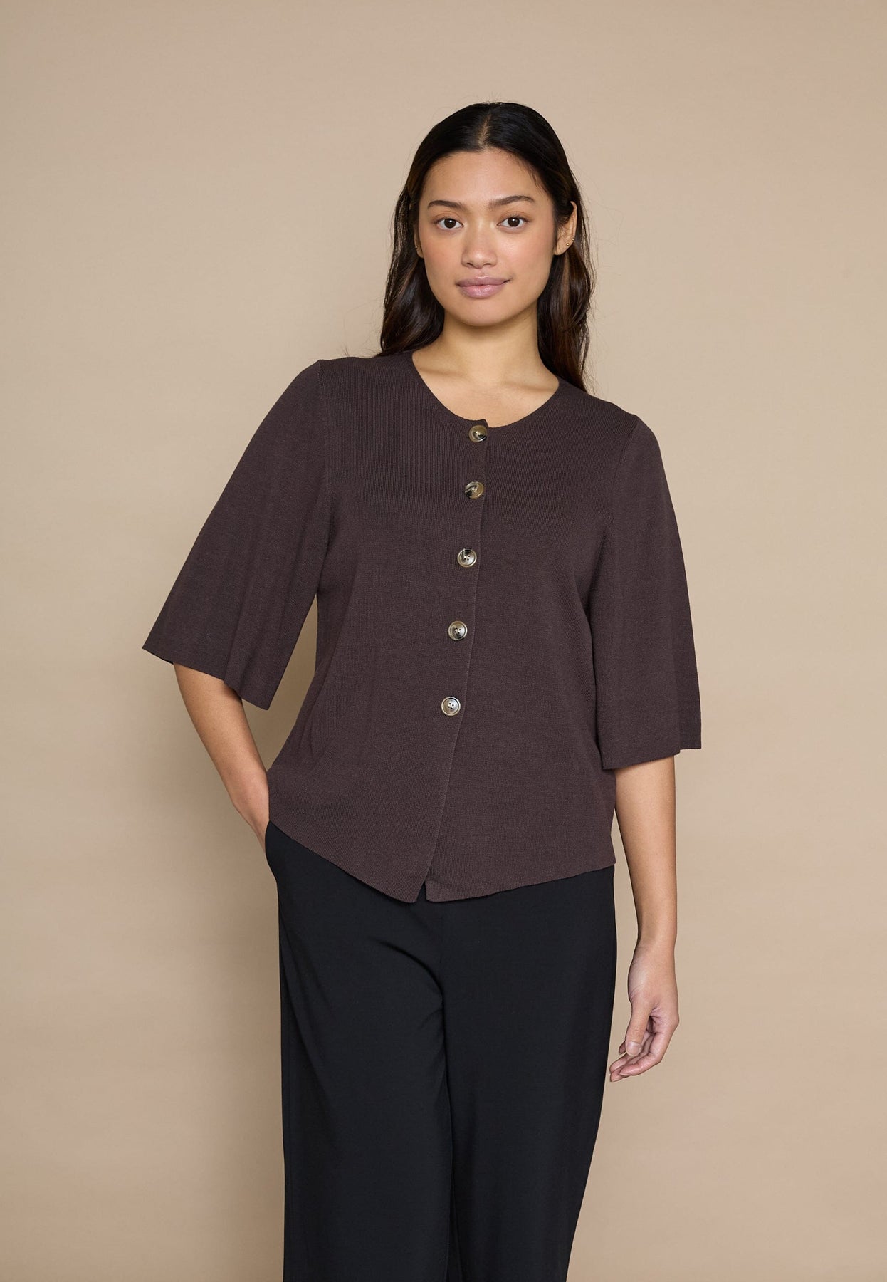 Gebreide top van Love & Divine in een bruine tint. De top heeft een ronde halslijn, een doorlopende knoopsluiting en driekwartmouwen met een klokvormige snit.