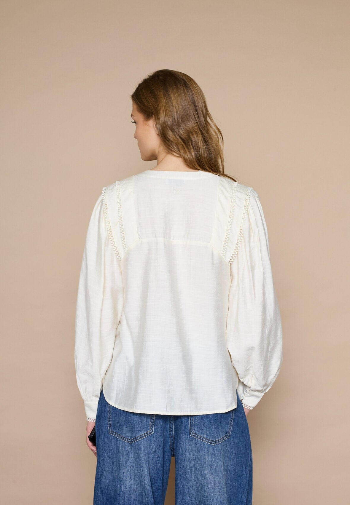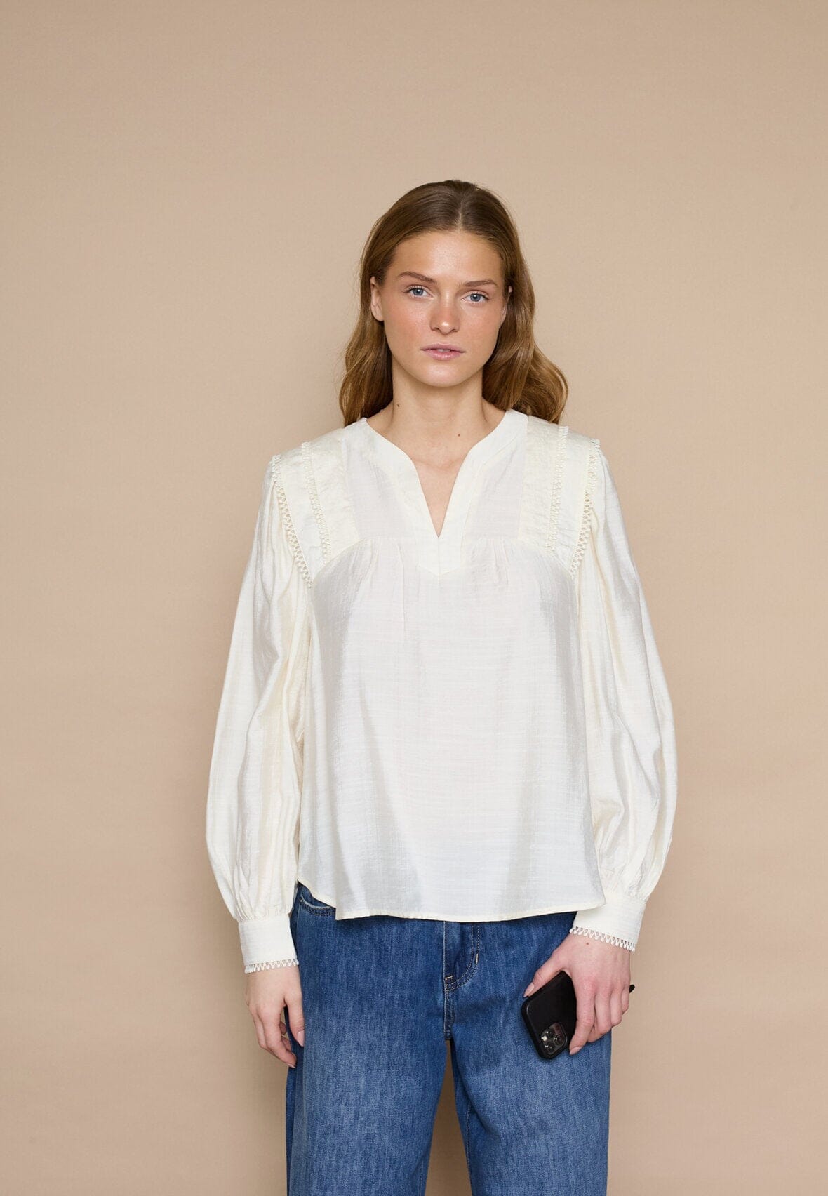 Crèmekleurige blouse van Love & Divine met een losse pasvorm en lange mouwen. De blouse heeft een V-hals en decoratieve ruches op de schouders en manchetten.