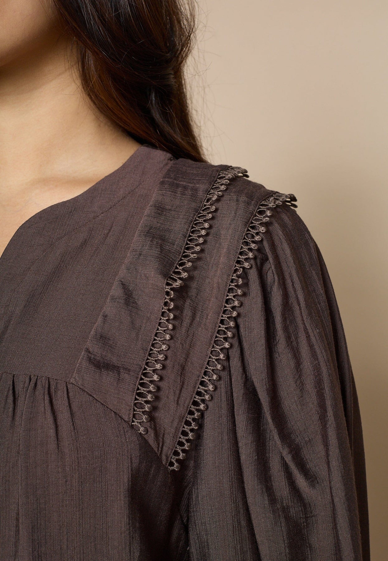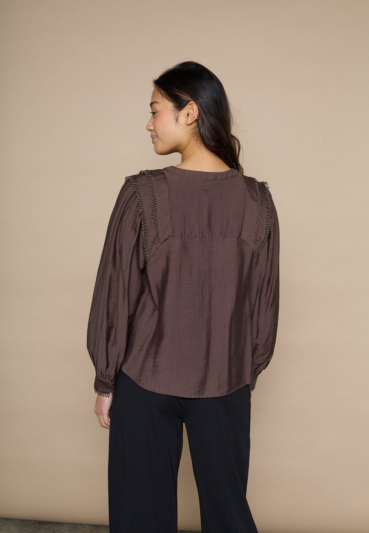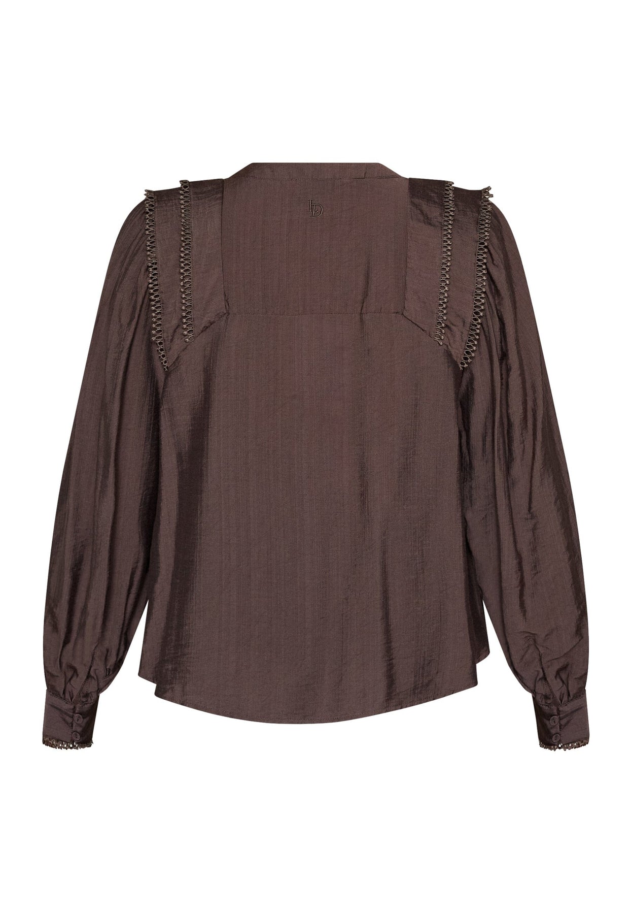 Donkerbruine blouse van Love & Divine, gemaakt van een mix van viscose en polyamide. De blouse heeft een V-hals en lange mouwen.