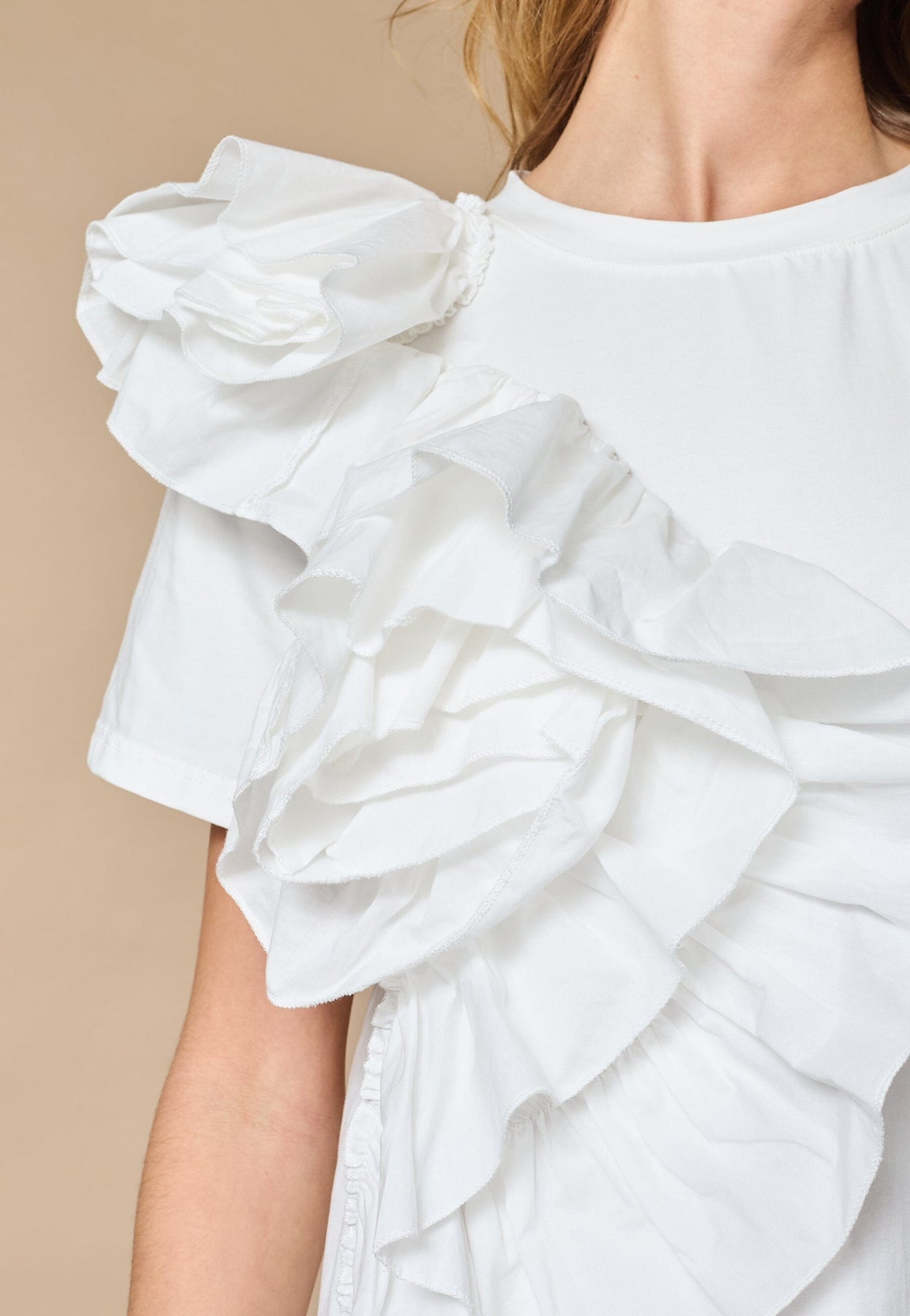 Wit T-shirt van Love & Divine met een asymmetrisch design. De top is versierd met grote, volumineuze ruches over één schouder en de borst.